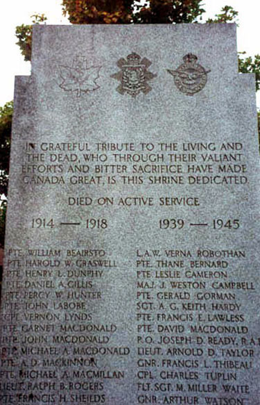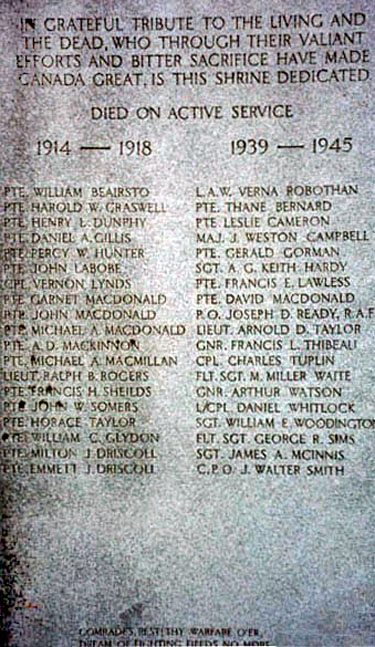 IN GRATEFUL TRIBUTE TO THE LIVING AND THE DEAD, WHO THROUGH THEIR VALIANT EFFORTS AND BITTER SACRIFICE HAVE MADE CANADA GREAT, IS THIS SHRINE DEDICATED