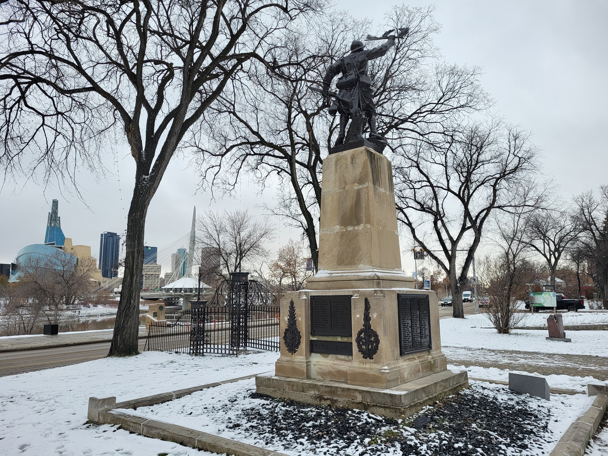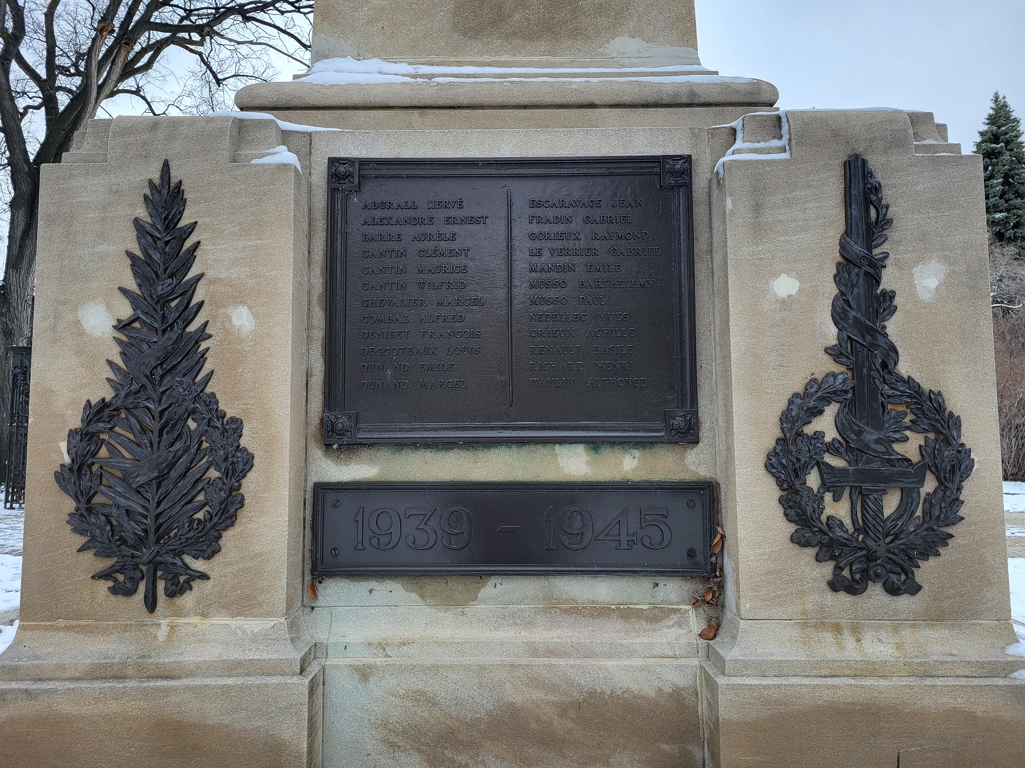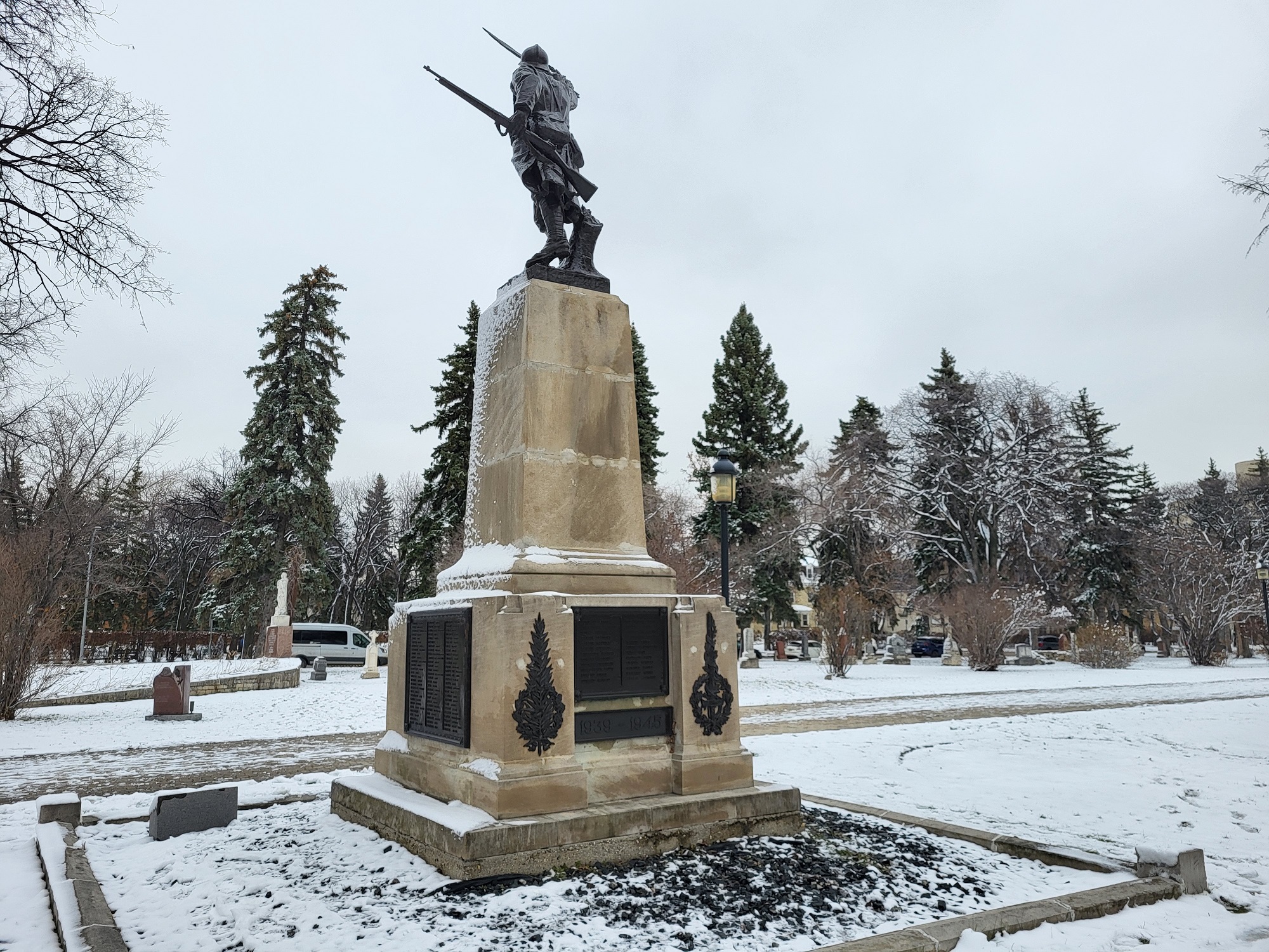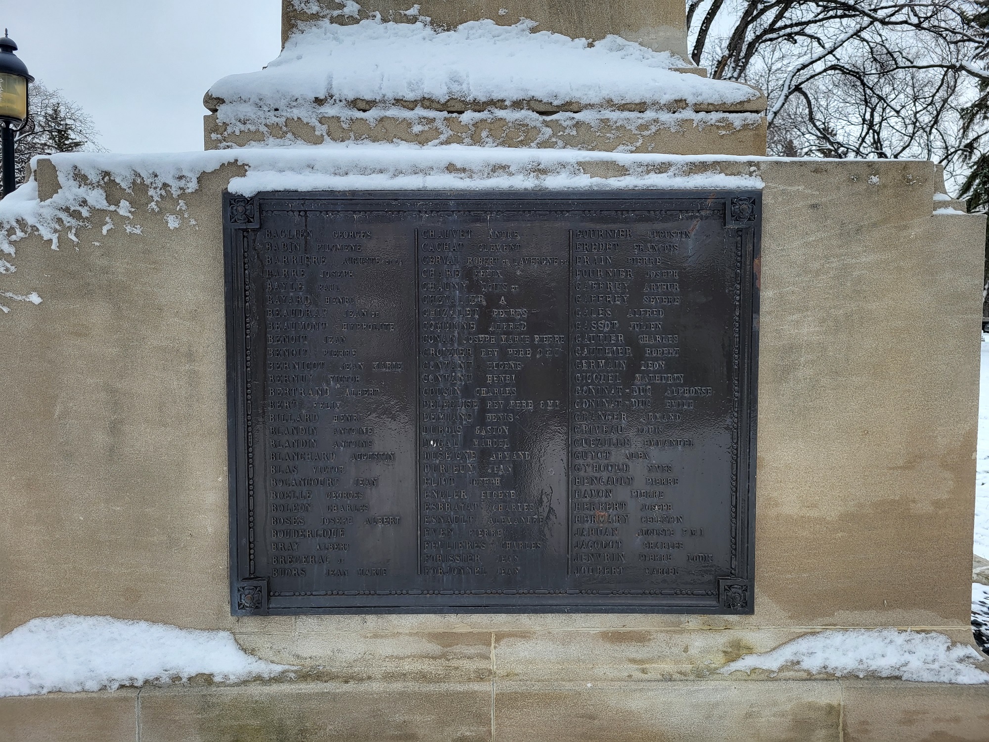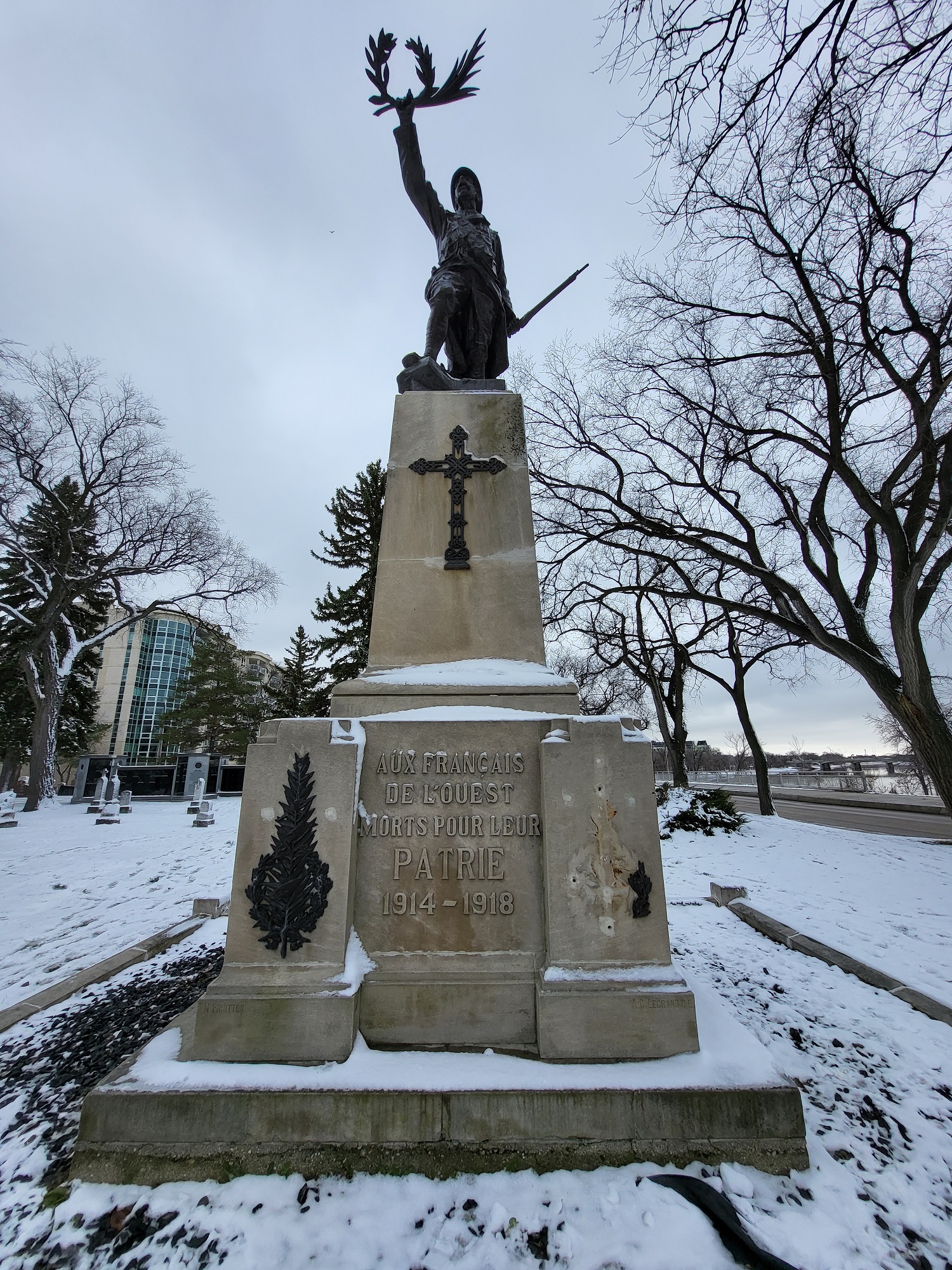 This monument is known as “Le Poilu”, a well-known expression in France for French soldiers who served during the First World War. It features a stone base with a statue of a soldier in uniform holding up a laurel wreath in his right hand and a rifle in his left hand. The memorial was built by Nicolas Pirotton and A.C. LeGrand and the statue was created by sculptor Eugene Benet. It was dedicated on 11 November 1920, to honour the Francophones of western Canada who died in the First World War.