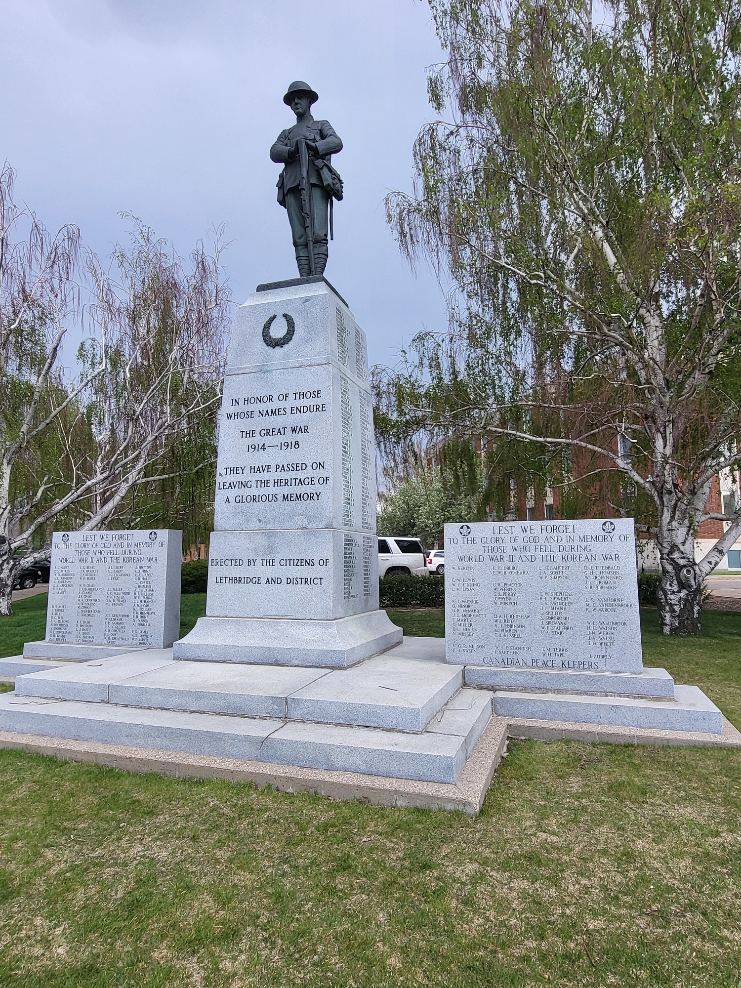 In 1956, Second World War and Korean War names were added and the cenotaph was enlarged. In 2000, the cenotaph was moved from its original site in Galt Gardens to its current location.