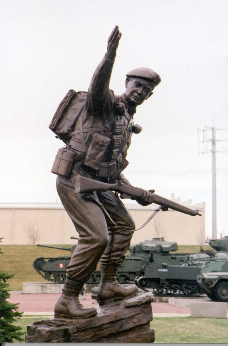 Major (Ret’d) Rod Middelton, Platoon Commander, Princess Patricia's Canadian Light Infantry, was one of the movers of the statue initiative. He designed the statue and provided the technical advice to the artists on the soldier’s dress and equipment throughout the statue’s creation. The statue was created by renowned bronze sculptor Don Begg of Studio West Bronze Foundry Ltd. The soldier is rising from a crouched observer’s position in the rocky terrain of Korea and signaling his unit forward to mount another attack during the battle of Kapyong. The soldier is in the full battle dress of the 2nd Battalion of the Princess Patricia’s Canadian Light Infantry. Begg used a 1960 - 70 photo of a Princess Patricia Canadian Light Infantry Junior Leader waving his men forward. In the original photo, the Infantry Junior Leader is in cold weather kit.