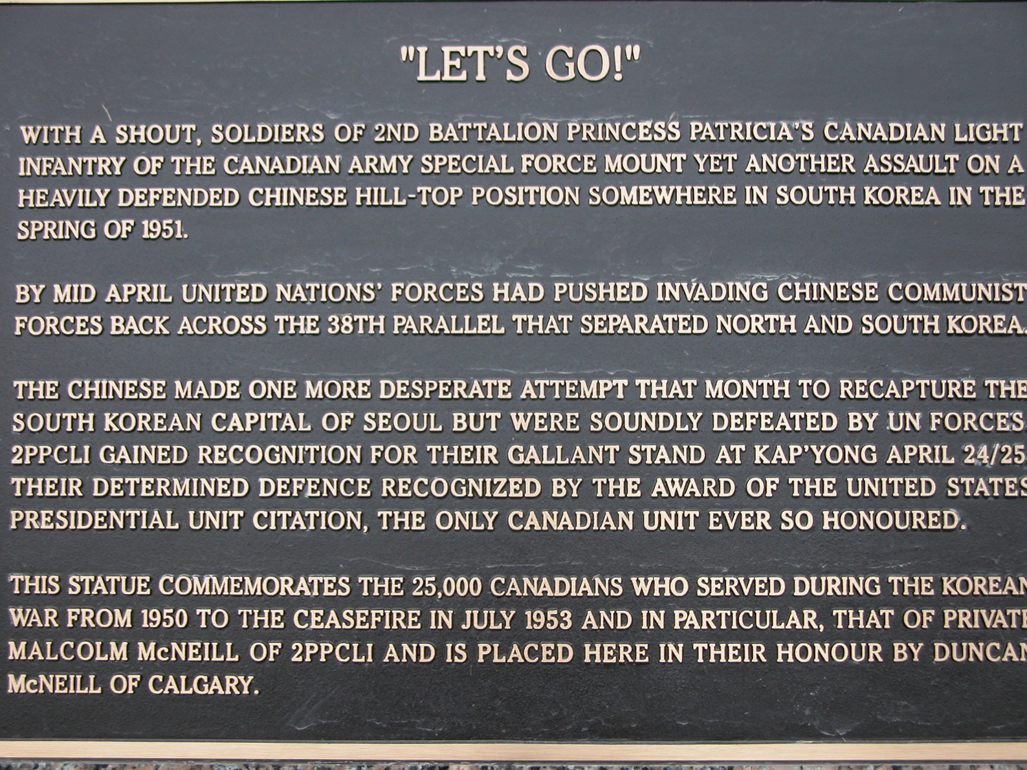 The Let's Go statue honours Veterans of the Korean War. Duncan McNeill approached the museum and offered to fund a statue that commemorated the service of Korean War Veterans. Duncan funded the statue in honour of his brother Private Malcolm McNeill, who served in Korea as a member of the 2nd Battalion, Princess Patricia's Canadian Light Infantry. The statue was unveiled on April 25, 2003, quite a special day in Canadian history - the anniversary of the Battle of Kapyong.
