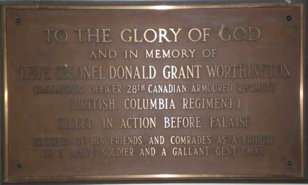 This memorial was erected in memory of Lieutenant-Colonel Donald Grant Worthington, Commanding Officer, 28th Canadian Armoured Regiment, by his friends and comrades, as a tribute to a brave soldier and a gallant gentleman.
