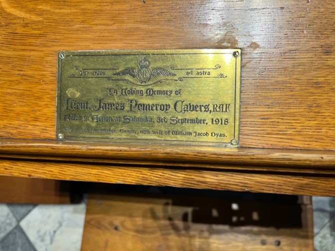 A litany desk at St. Albans Cathedral was dedicated to the memory of Lieutenant James Pomeroy Cavers by his mother, Estelle Dyas (formerly Cavers). James was born on 29 December 1891, son of W. A. and Estelle Cavers in Galt, Ontario. He was a student at Upper Canada College when he enlisted in the Eaton Machine Gun Battery on 28 January 1915. After a gunshot wound to the leg on 31 July 1916 at the Somme, he was discharged on 25 November 1916. He transferred to the Royal Flying Corps Canada on 4 July 1917 and served as a lieutenant in Greece near Salonika with the 150th Squadron. During a reconnaissance mission on 3 September 1918 his plane was hit by gunshot and fell into Lake Dorjan. James was shot and killed while attempting to swim to shore.