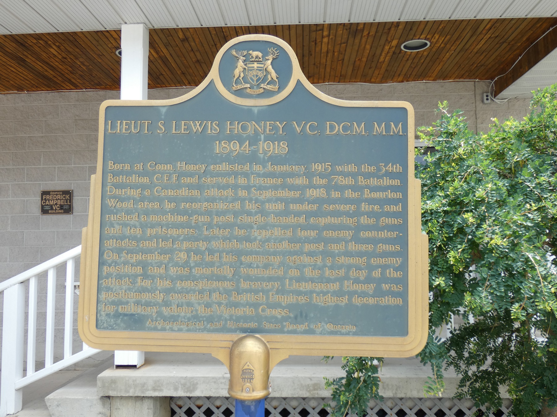 The Lieutenant S. Lewis Honey Plaque was erected by the Archaeological and Historic Sites Board of Ontario. It was previously located outside the United Church on Queen Street East before it was moved to the Legion in 1964.