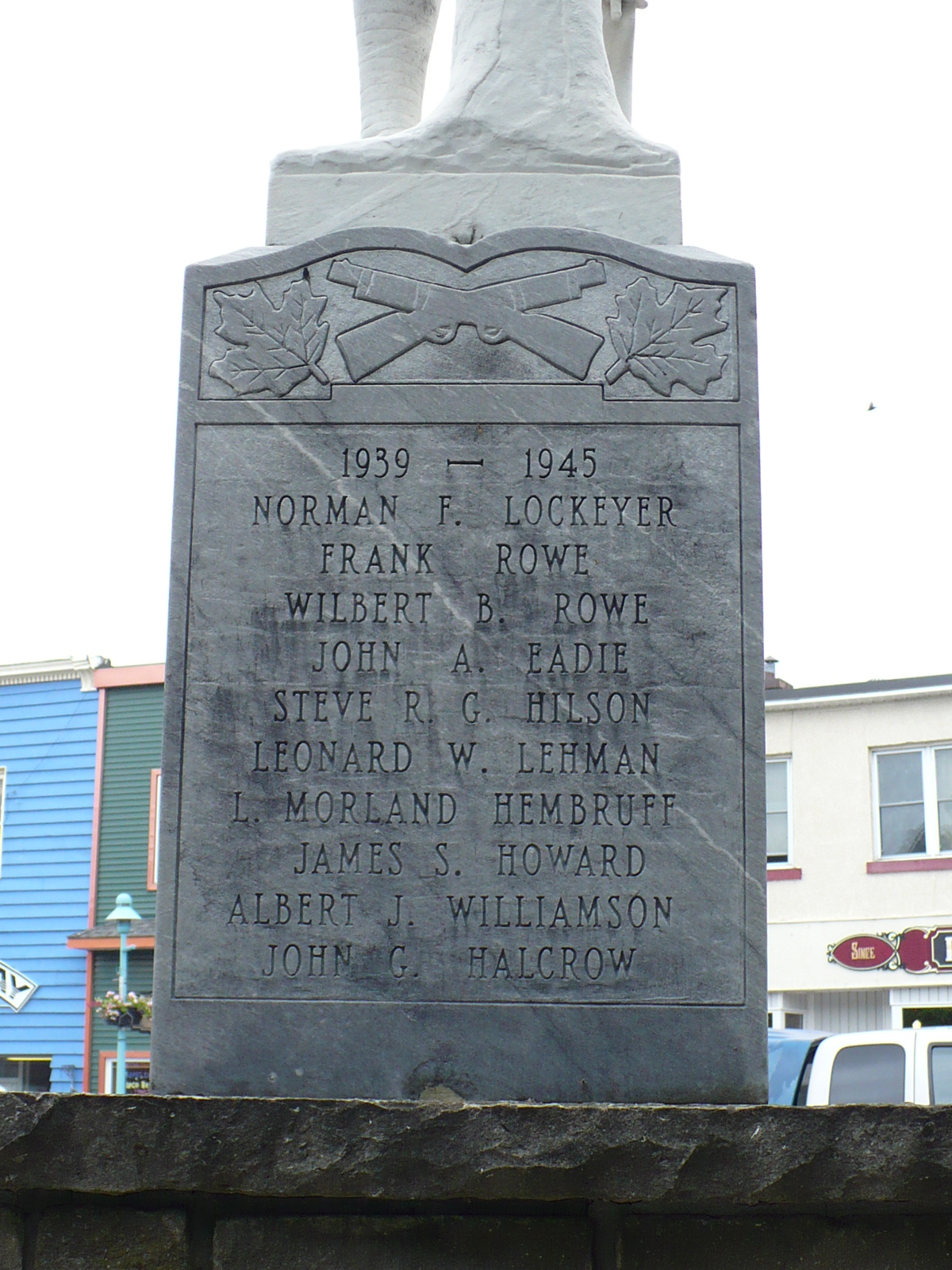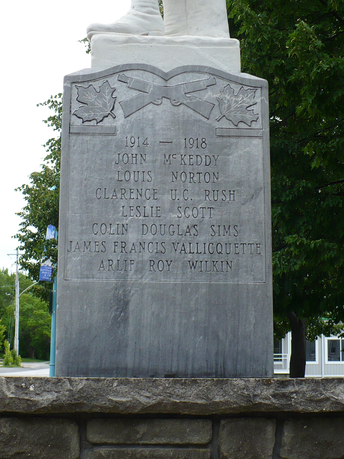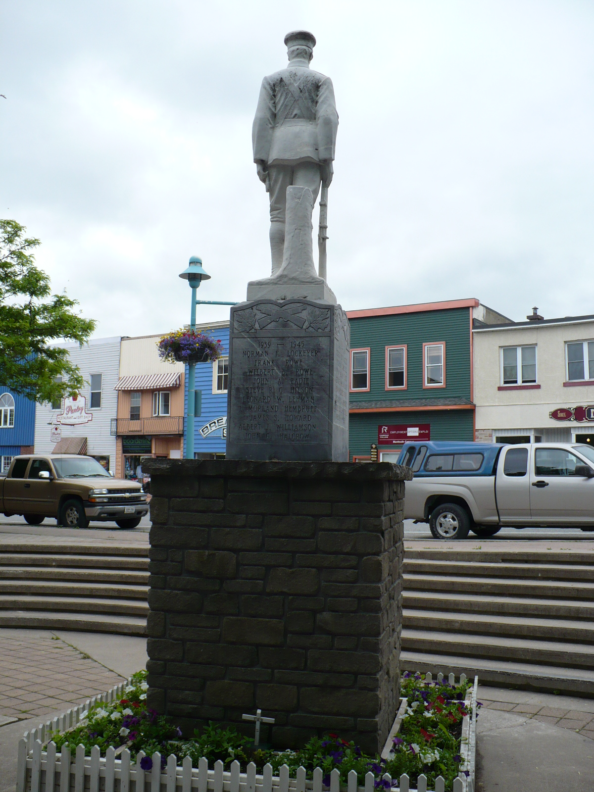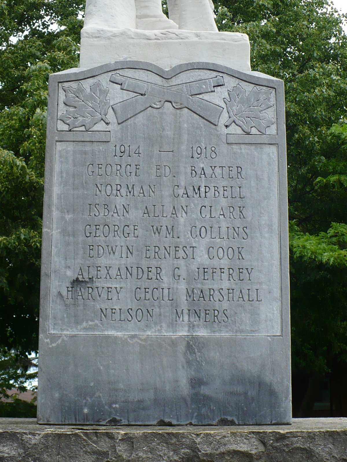 A First World War soldier stands at attention on top of this memorial. It was originally erected to honour those who lost their lives in the First World War. Their names are inscribed on the left and rights sides of the memorial.