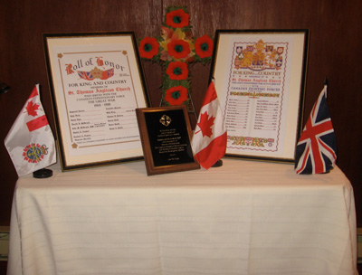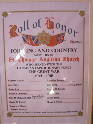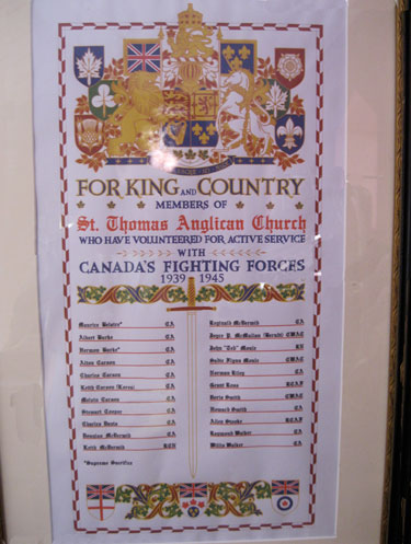 These Rolls of Honour and plaque are in memory of those parishioners who served during the First and Second World Wars, erected by the congregation of St. Thomas Anglican Church in 1946. The restored monument was rededicated by Brig-Gen (Ret'd) Gerald Peddle, OMM, CD, former chaplain general of the Canadian Forces, at a special service held on Sunday November 8th 2009.