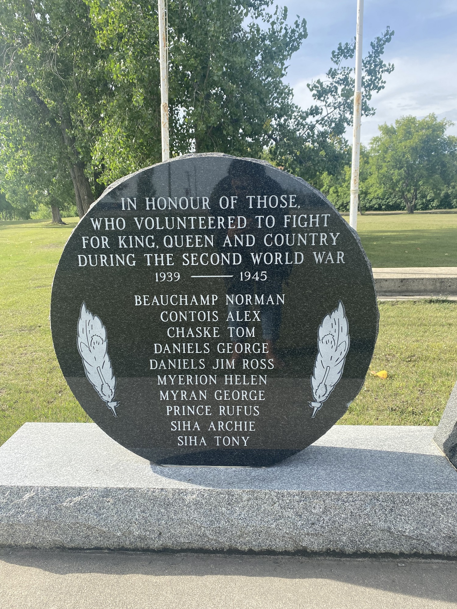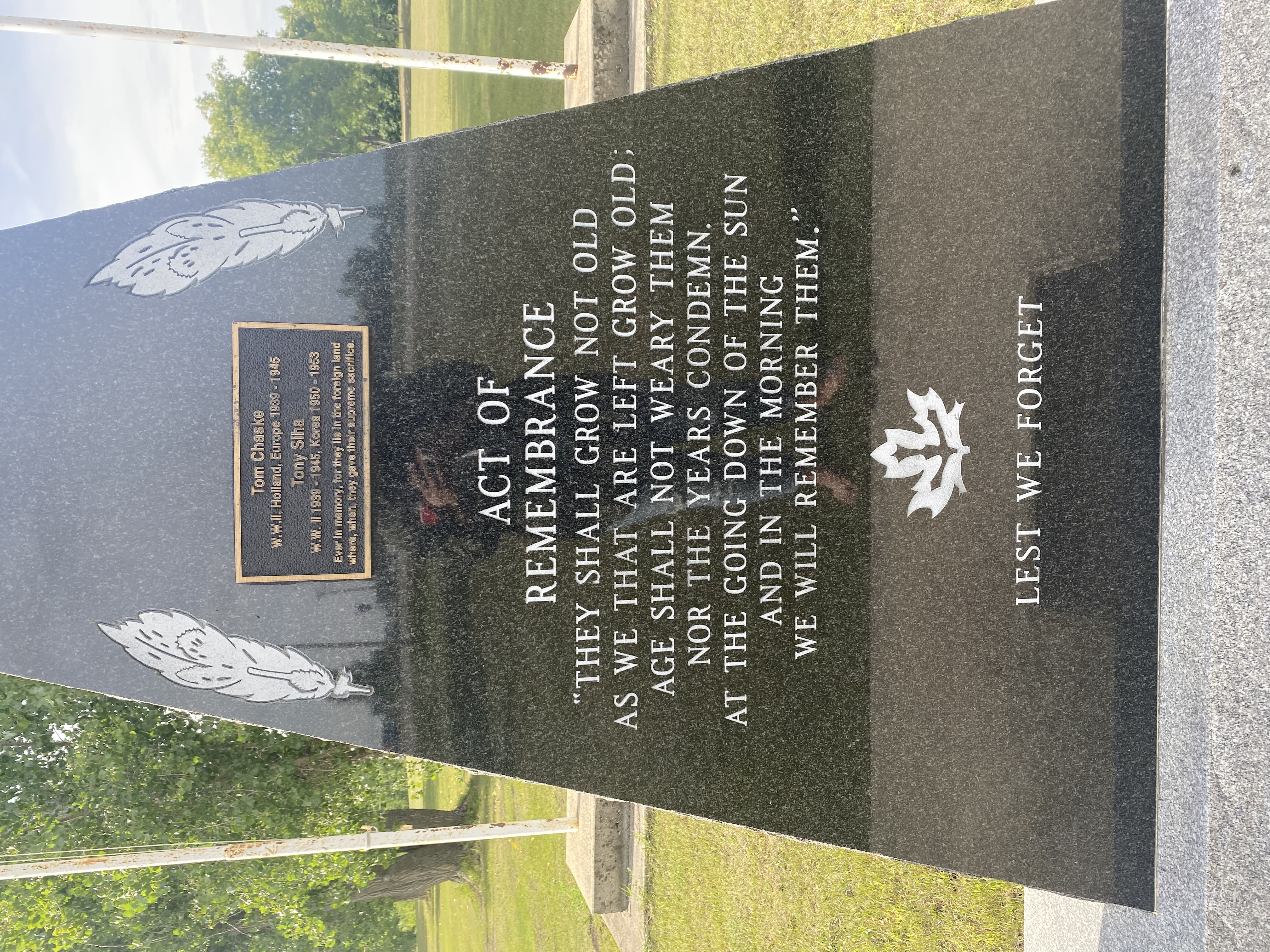One of the first things Dennis Meeches did when elected Chief in 1998 was visit his uncle, Second World War Veteran George Myran. Dennis presented his uncle with tobacco and asked him to work on a sacred project of building a cenotaph to honour their Veterans. George's design features a center piece shaped in the form of a tipi and on either side are round slabs with Veterans' names inscribed.