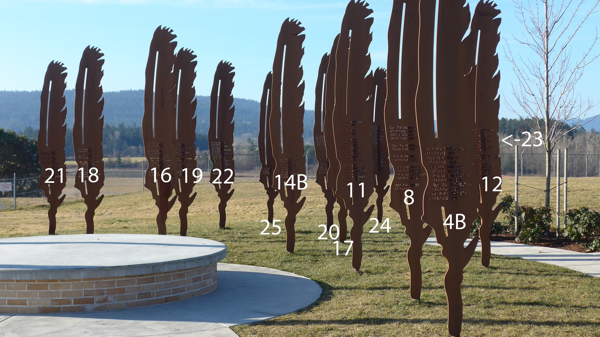 The memorial was selected by the Victoria Airport Authority and a working group to increase the awareness of the proud military history of the airport. The names of the lost airmen were water jet cut into twenty-five Corten steel Cooper’s Hawk feathers. The Cooper’s Hawk is a predator known for its extraordinary agility in flight and ferocity in hunting. Symbolically the feathers create an allegorical narrative about the spirit of these fighting men who were training to be Canada’s airborne warriors. The eight feet high feathers were arranged chronologically in a military matrix with some removed, representing the randomness and divergent accident locations.
