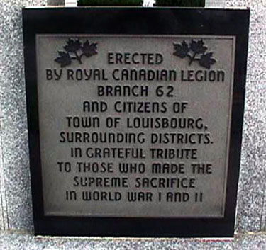 This memorial is dedicated to the citizens of Louisbourg and surrounding districts who died while serving in the First and Second World Wars. It was erected by the Royal Canadian Legion Branch 62 and the citizens of Louisbourg and surrounding districts.