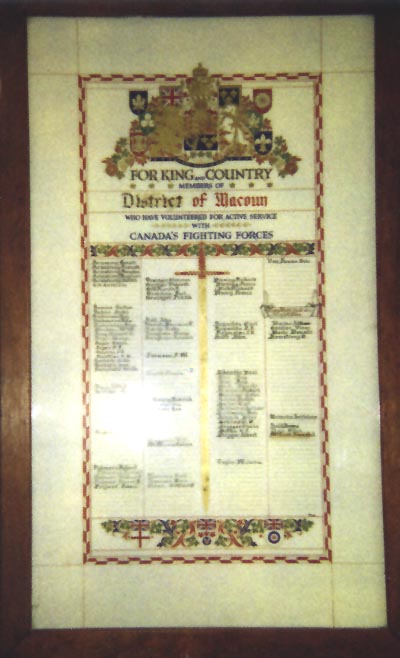 This certificate lists the names of the members of the District of Macoun who volunteered for active service with the Canadian military during the Second World War.