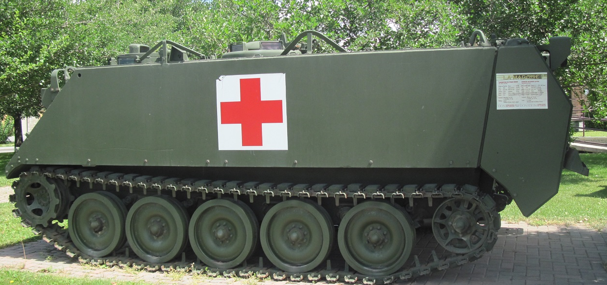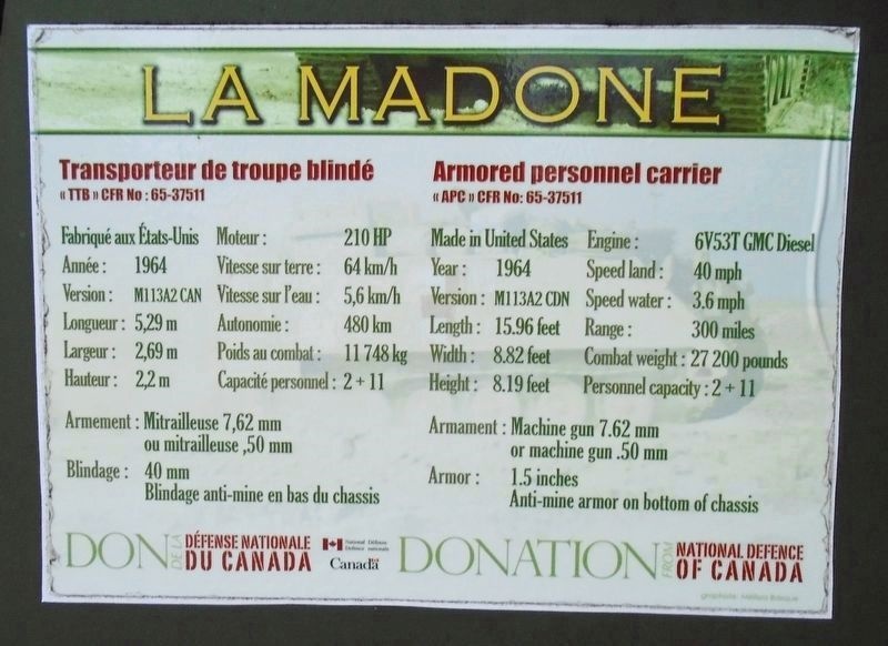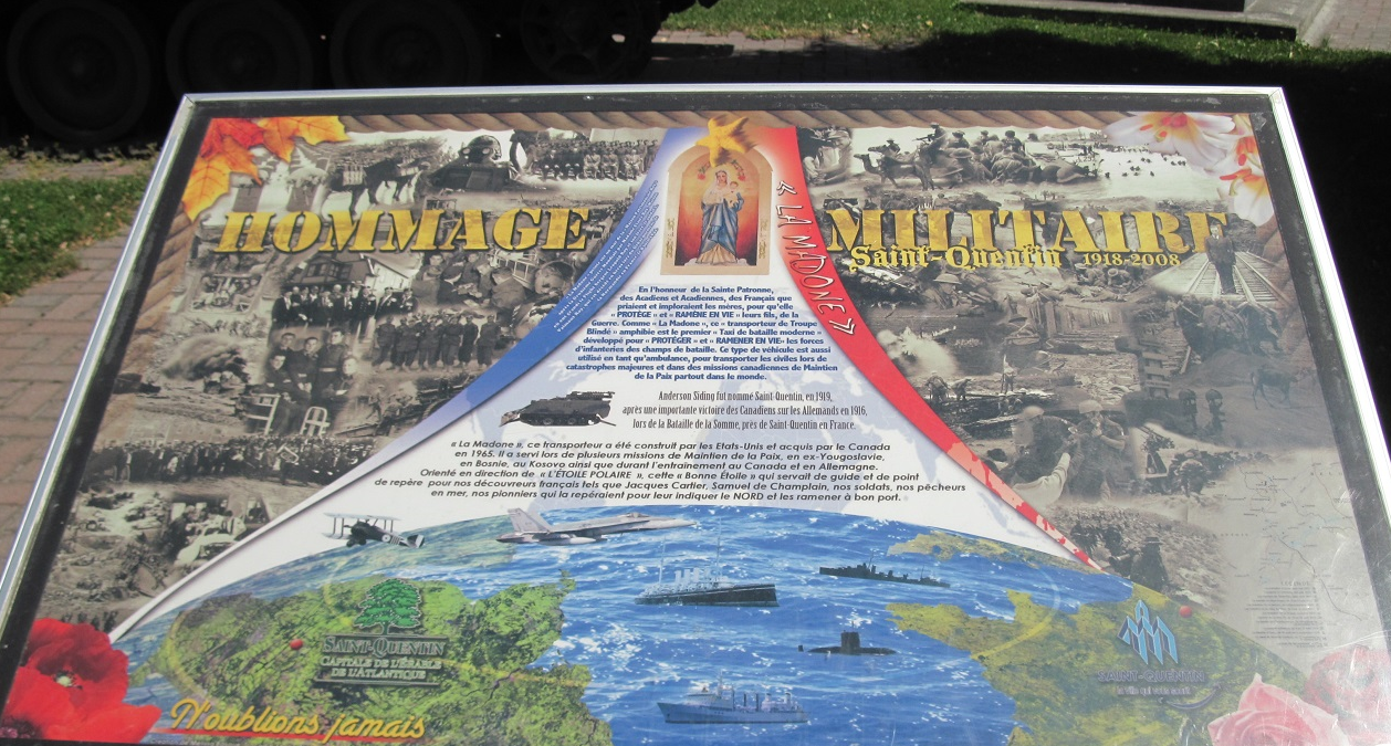 In honor of the Patron Saint of the Acadians, the French prayed and implored mothers to protect and bring back their sons from the War. Like "The Madonna", this Amphibious Armored Troop Carrier is the first "Modern Battle Wagon" developed to protect and bring back alive the infantry forces from the battlefields. This type of vehicle is also used as an ambulance, to transport civilians during major disasters, and for Canadian peacekeeping missions around the world.