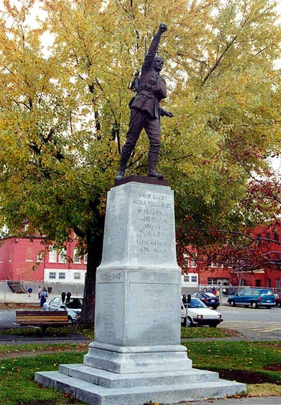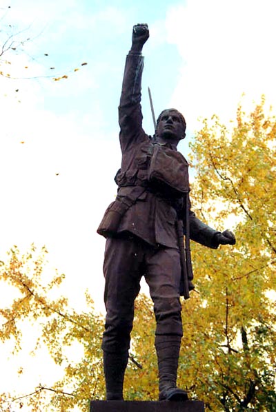 George Hill’s monument at Magog features a statue of a triumphant Canadian soldier who is bare-headed, the raised right hand clutches a Mills bomb, the left fist is clenched. The Canadian Tommy has triumphed, he has come though, he rejoices in the thrill of victory.