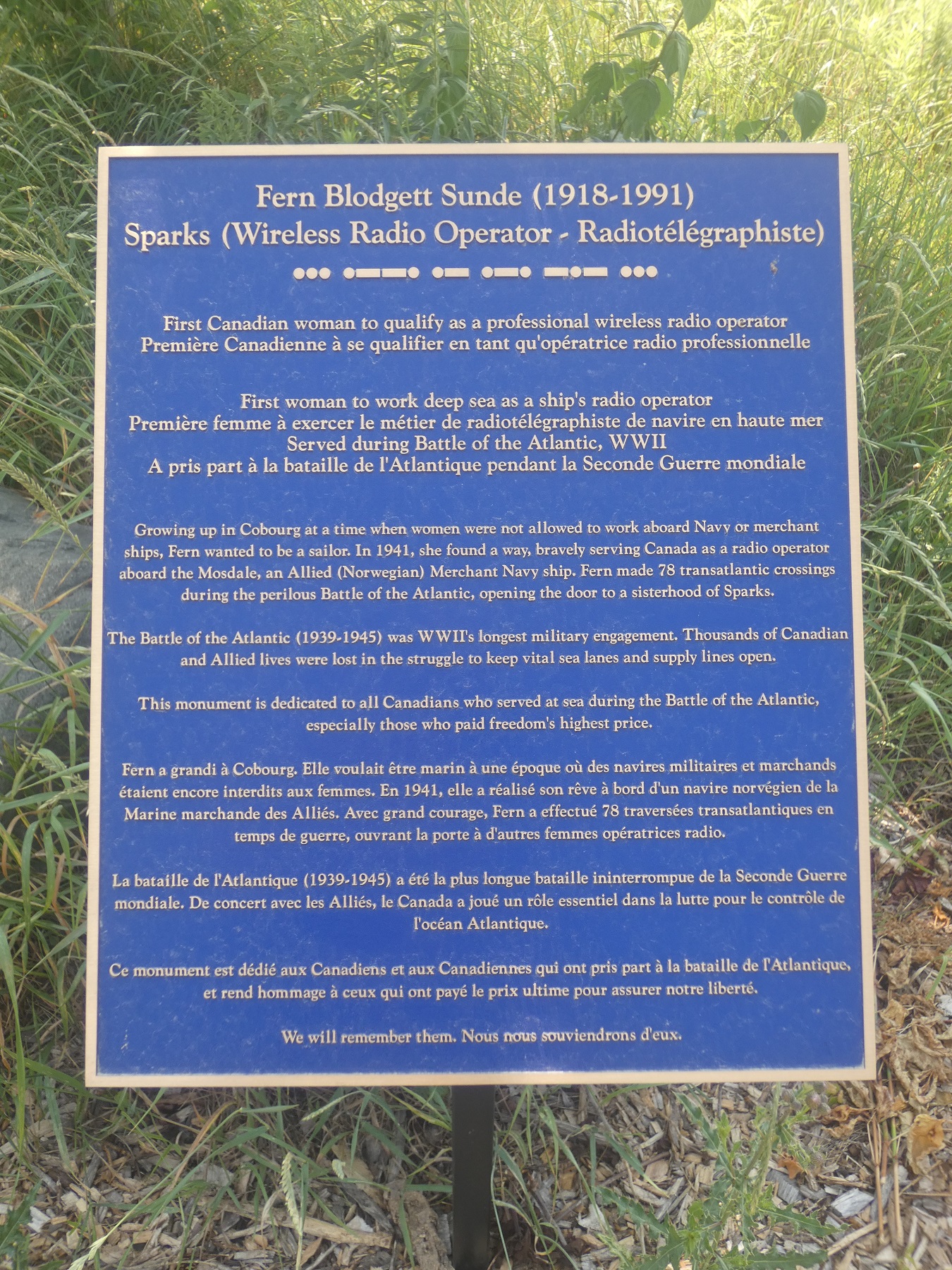 Fern Blodgett Sunde grew up in Cobourg and dreamt of becoming a sailor. She learned only boys could work at sea, so when the Second World War began she applied to become a wireless radio operator. The first two schools turned her down because she was a woman, but she persisted and a third school, the Radio College of Canada, accepted her.