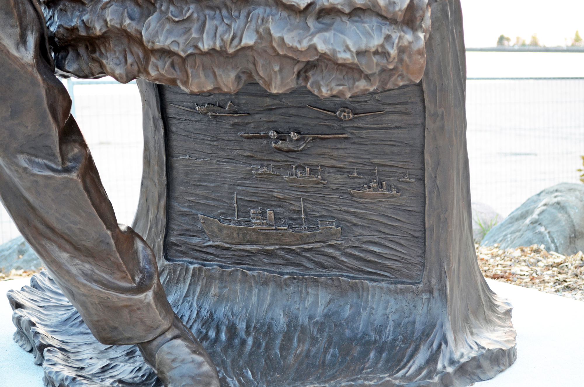 A relief is sculpted in the wave, depicting Canada's role in the Battle of the Atlantic.