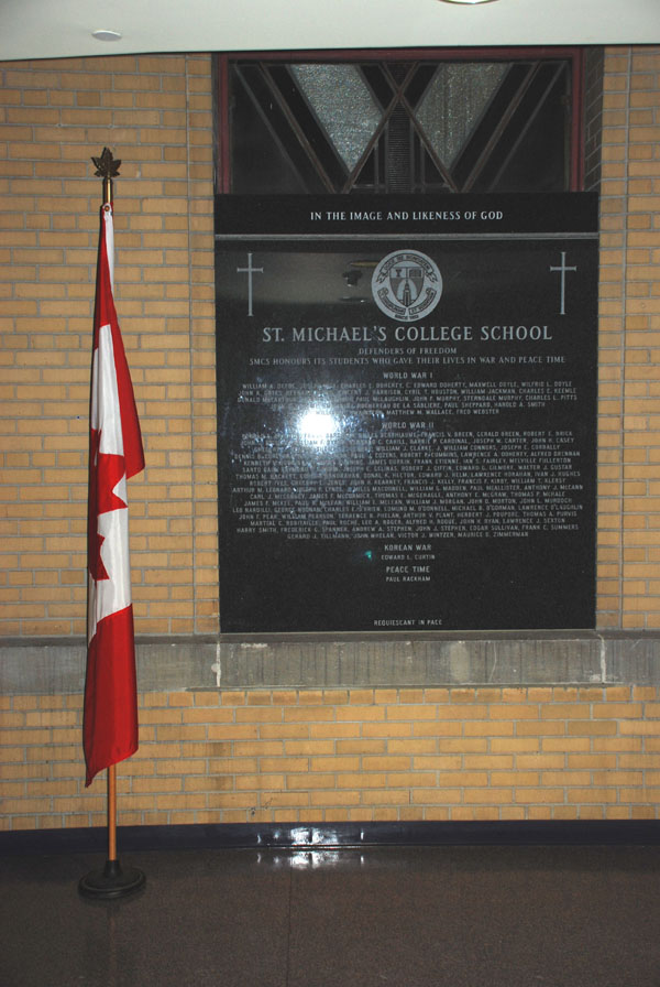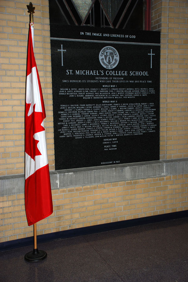 This memorial is dedicated to the St. Michael's College School's war dead from the First and Second World Wars, Korea and in peace time, unveiled 10 June 2000. The memorial lists the name of each student killed. Some served with other Allied forces but all attended St. Michael's College School. Not all were graduates of St. Michael's College School. This memorial was created in conjunction with the Tulip Tribute promoted by Canada Remembers to commemorate the 50th Anniversary of VE Day on 8 May 1995. The tulips were planted by Fr. C. Zinger C. S. B. and student volunteers as part of the "Tulip Tribute: Shore to Shore" promoted by Canada Remembers in 1994. The memorial was created at the instigation of Fr. W. O'Brien, C. S. B., himself a veteran and the school's founding archivist. (Refer to memorial number 35102-005)