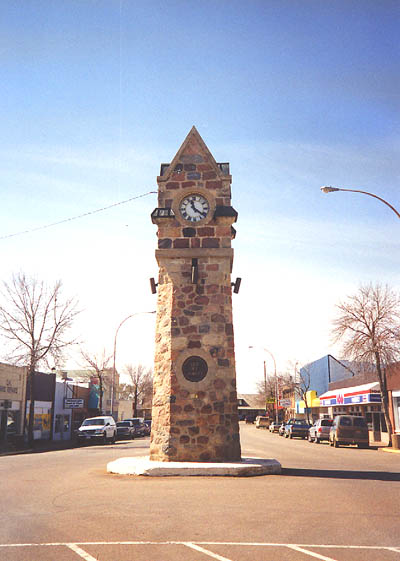In 1925, the memorial clock was dedicated by the Walter Musson Charter, The Imperial Order Daughters of the Empire, to the men that fought and were lost in World War I. Mr. Frank Balley was the stonemason who built this tower and also did the architectural design for it. The stones were gathered by the school children from town and also farmers bringing in some when they came to town. They say most of the rocks that the school children gathered were from Norman Cooper's farm a little ways east of town. The clock that was installed into this Cenotaph came from England and was run from batteries until the main street was paved in 1958-1959 when it was changed over to electric.