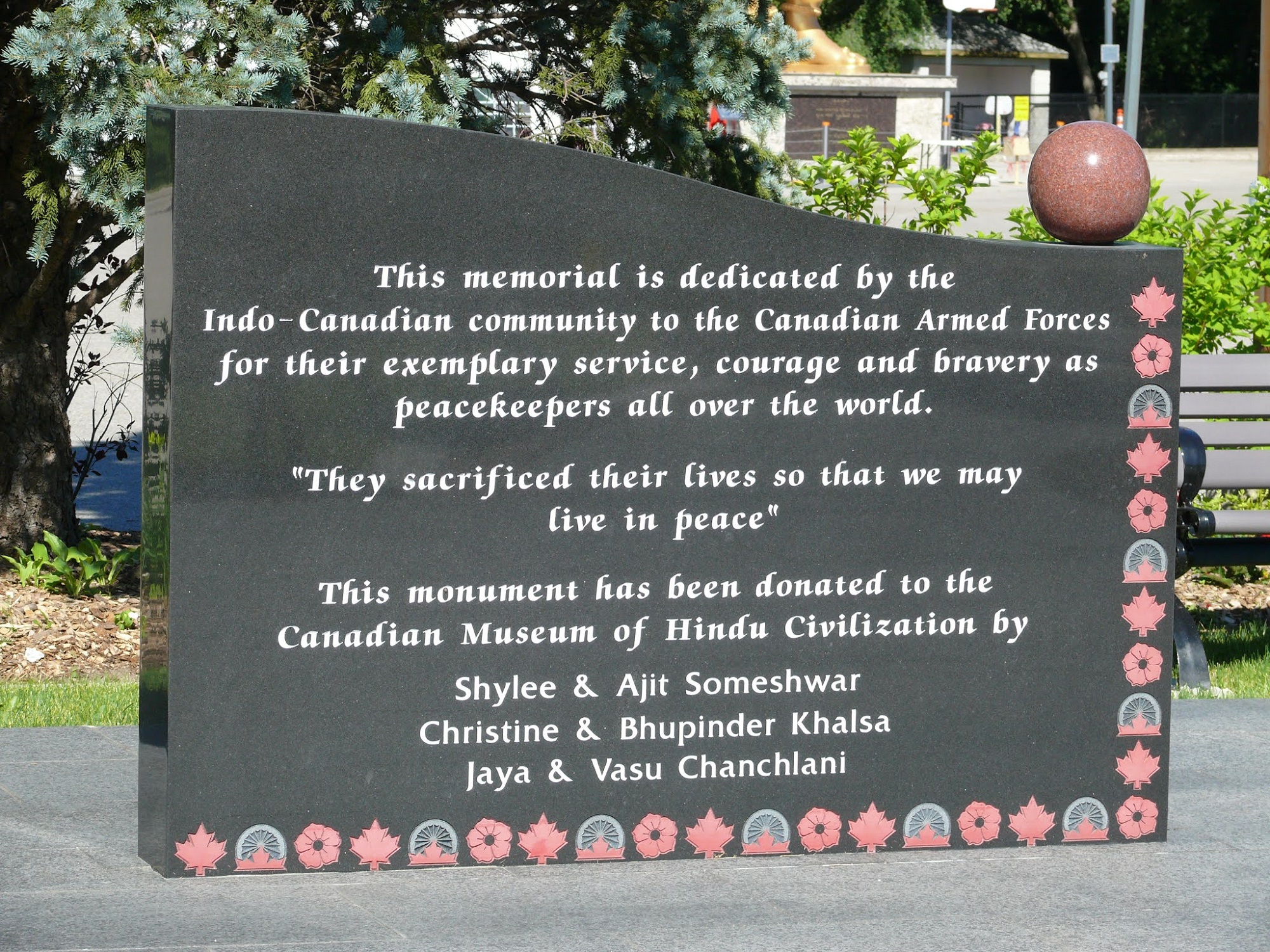 Shaped as a maple leaf, it is exquisitely carved in black granite (Nerro Assuloto) and Imperial red granite, sourced from southern India. Standing tall a towering height of 12 feet, the gleaming monument weights over 15 tons. This monument is designed to capture the glory and heroism of our armed forces. A symbol of peace and patriotism, the memorial is placed next to the statue of Mahatma Gandhi. The CMOHC has also created a Wall of Heros in their museum, listing the names of all soldiers that have died in Afghanistan. The priests in the attached temple offer prayers for each of the names at sunrise and sunset daily.