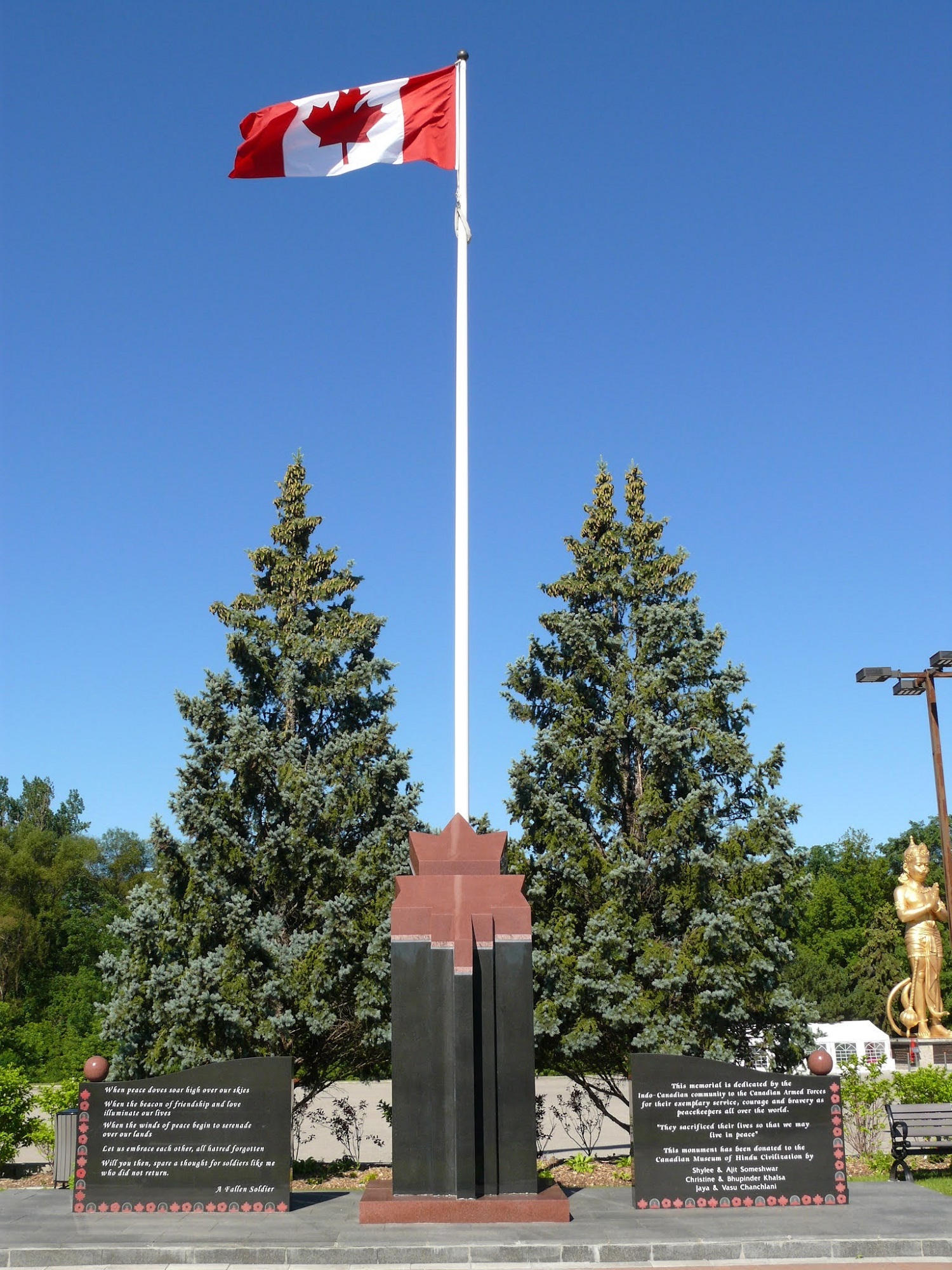 The Memorial to the Fallen Soldier was erected by the Indo-Canadian community, with the contribution of Canadian Museum of Hindu Civilization (CMOHC) and its donors. They presented the monument as an offer of respect and gratitude to the Canadian Armed Forces, and also dedicated it to Canadian soldiers who sacrificed their lives during Canada's peace keeping efforts. The monument was unveiled on October 2, 2010, by CMOHC.