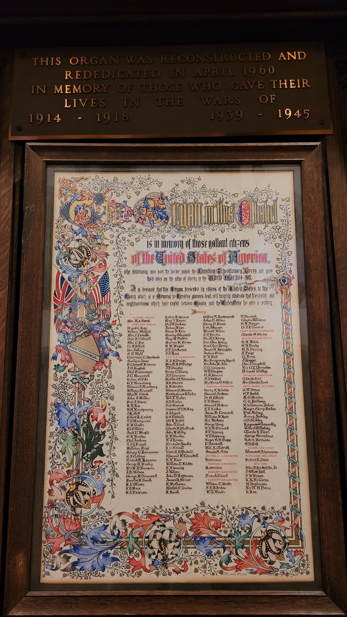 The next morning at breakfast, Senator Booth said that he and his wife were amazed to hear that some fifteen hundred Americans were killed while serving with the Canadian army. He suggested, in the interest of international good will, that he should start a movement to have the organ erected in memory of those citizens of the United States of America who had crossed the border, joined the Canadian Expeditionary Force and had given their lives. He went on to say that if this appealed to the Trustees of Canadian Memorial Chapel, he would start the fund by subscribing five thousand dollars. The organ was costing thirty thousand. Senator Booth worked faithfully towards funds for the organ, as did many of his friends in Portland, Seattle, Eugene, Tacoma, and other Pacific Coast cities.