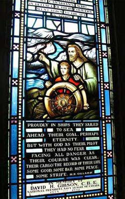 This window features images of a young sailor with God behind the ship's wheel. Donated in memory of David H. Gibson, CBE, who was the National President, Navy League of Canada, 1938-1952. The window is dedicated to Canadians who died at seas in the defence of the country. The window includes a poem by H.R. Gillarm.
