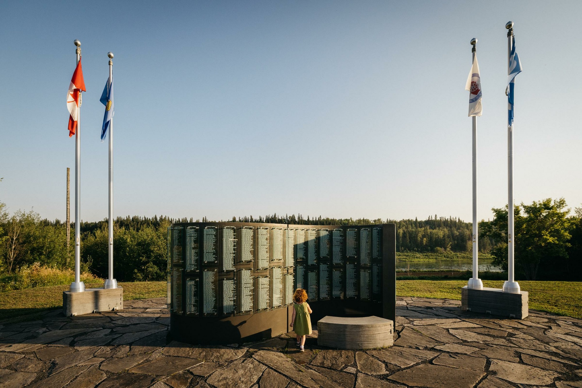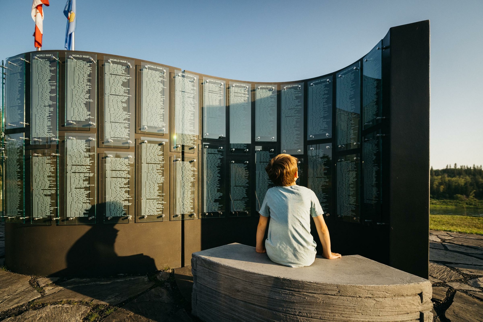 Glass didactic panels face the walkway that leads to the monument. Stories and illustrations on the didactic panels describe the battles and wars that Métis people were involved in, beginning with the Battle of Seven Oaks through to the current Peacekeeping times. The imagery of which, depending on the time of day, silhouette against the grass or pathway. As more information comes over time the glass panels on the monument and didactic panels can be recycled and reprinted in order to update information such as the inclusion of more Métis Veteran names.