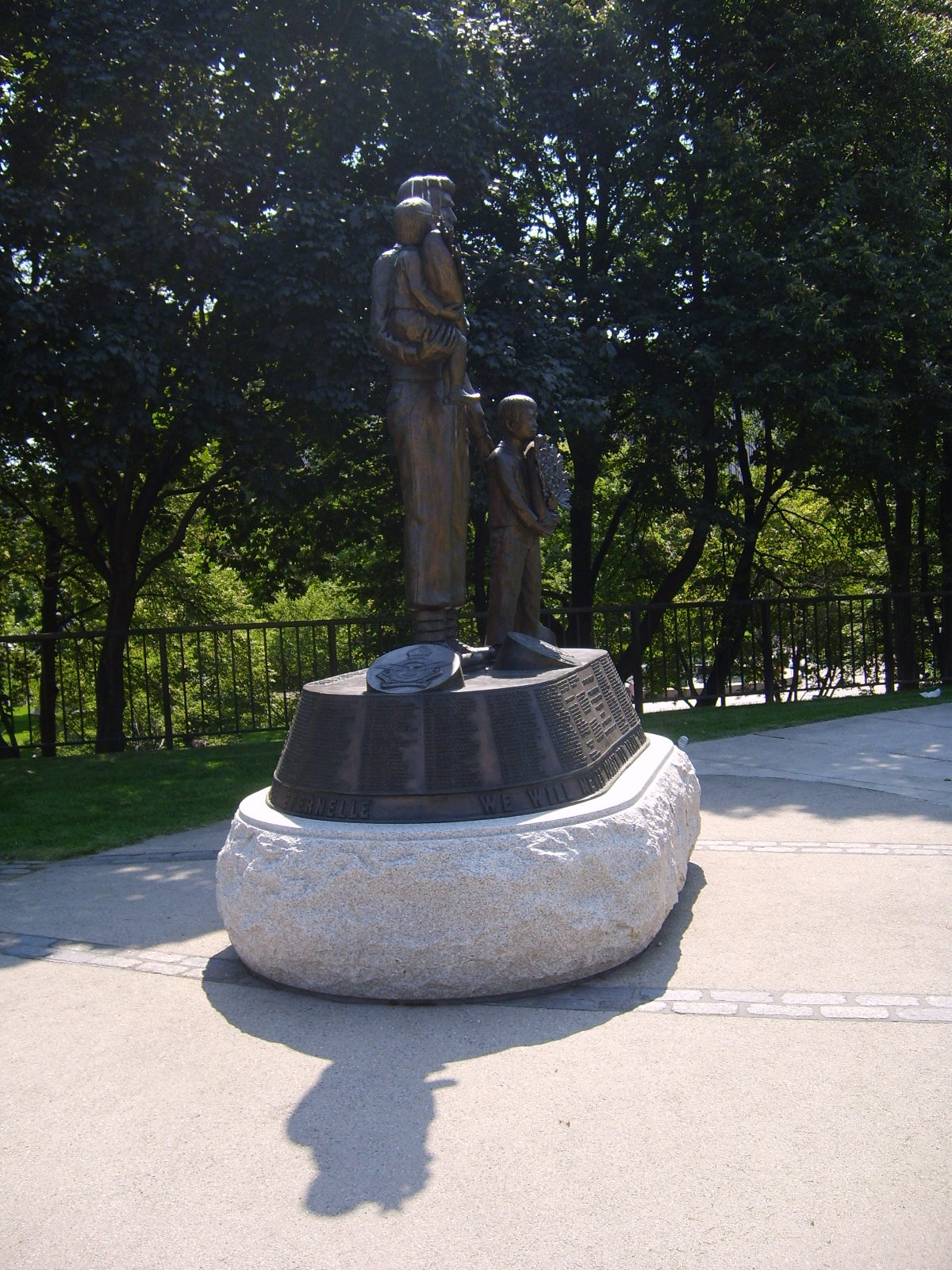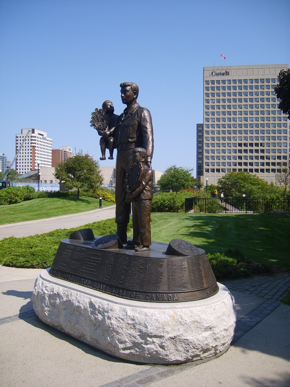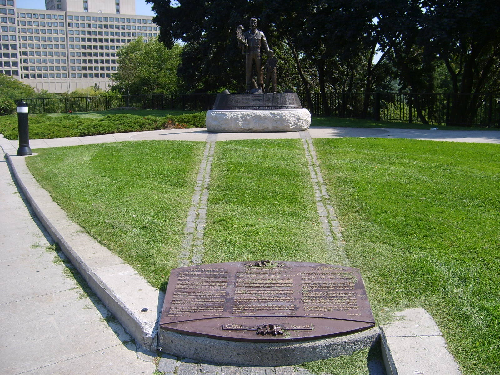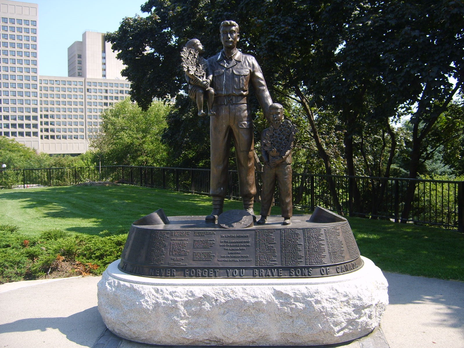 The Monument to Canadian Fallen commemorates more than 30,000 Canadians who served in the Korean War from 1950 to 1953 and as peacekeepers in Korea until 1957. It was erected by the National Capital Commission and dedicated on September 28, 2003. The monument was designed by Princess Patricia's Canadian Light Infantry Korean War Veteran Vincent Courtenay and created by Korean artist Yoo Young Mun in 2002. It is a slightly larger replica of the monument at the United Nations Memorial Cemetery in Busan, Korea, where 378 Canadians are buried.