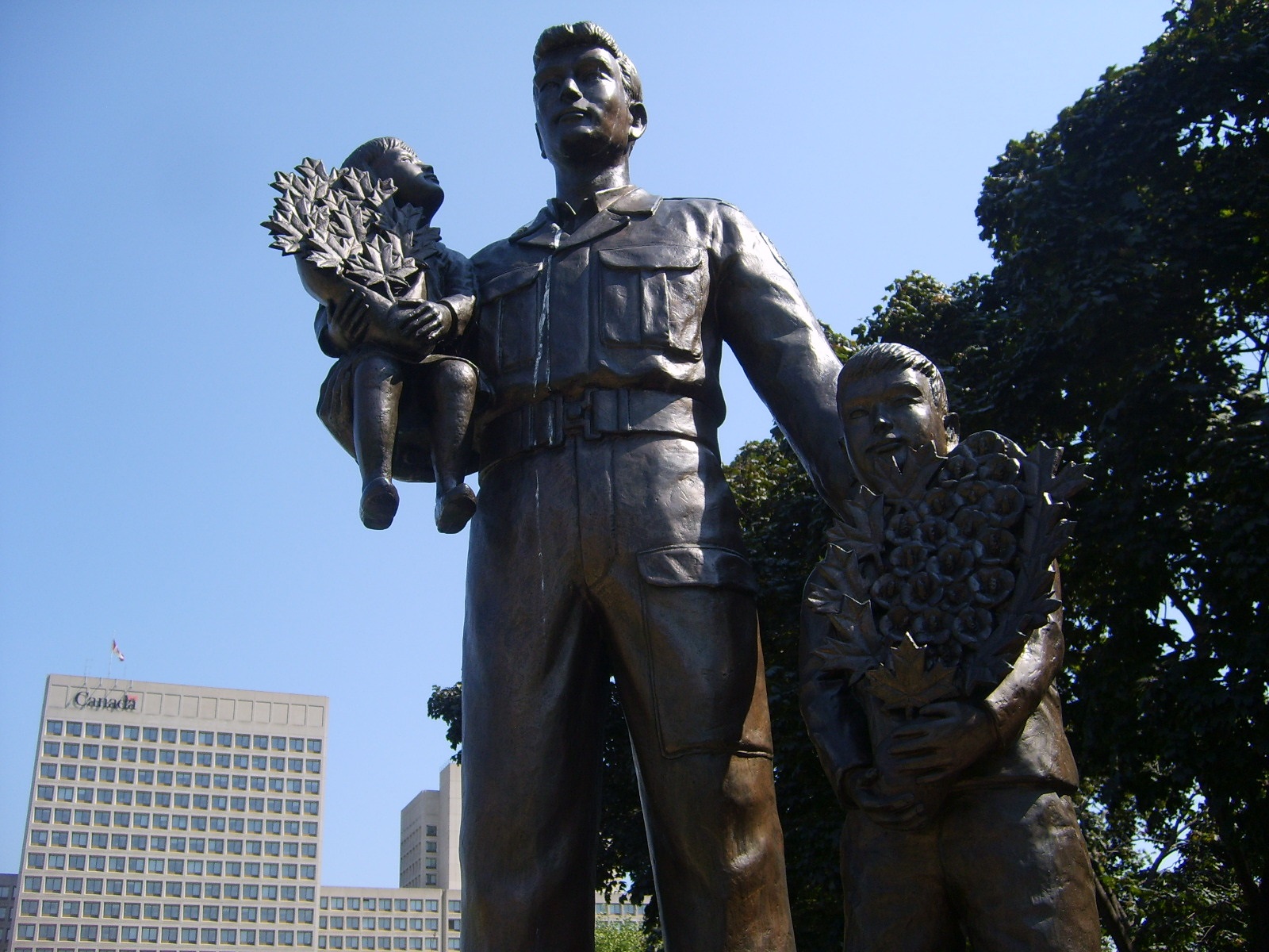 The statue is an unarmed Canadian soldier holding a young Korean girl and guiding a Korean boy. At the feet of the soldier are the crests of the Royal Canadian Air Force (left), Canadian Army (center), and Royal Canadian Navy (right). The children represent the generations of Koreans who live in freedom thanks to those who served and those who made the supreme sacrifice. The girl is holding a bouquet of 21 maple leaves, representing the 16 Canadians with no known grave and the five Canadian sailors lost at sea. The boy is holding a bouquet in which maple leaves are mixed with roses of Sharon, the national flower of Korea, as a symbol of the friendship between the two countries. The oval bronze base has two rings - the top is inscribed with the names of fallen soldiers and the bottom ring has a patriotic inscription. The bottom base is made of Korean granite.