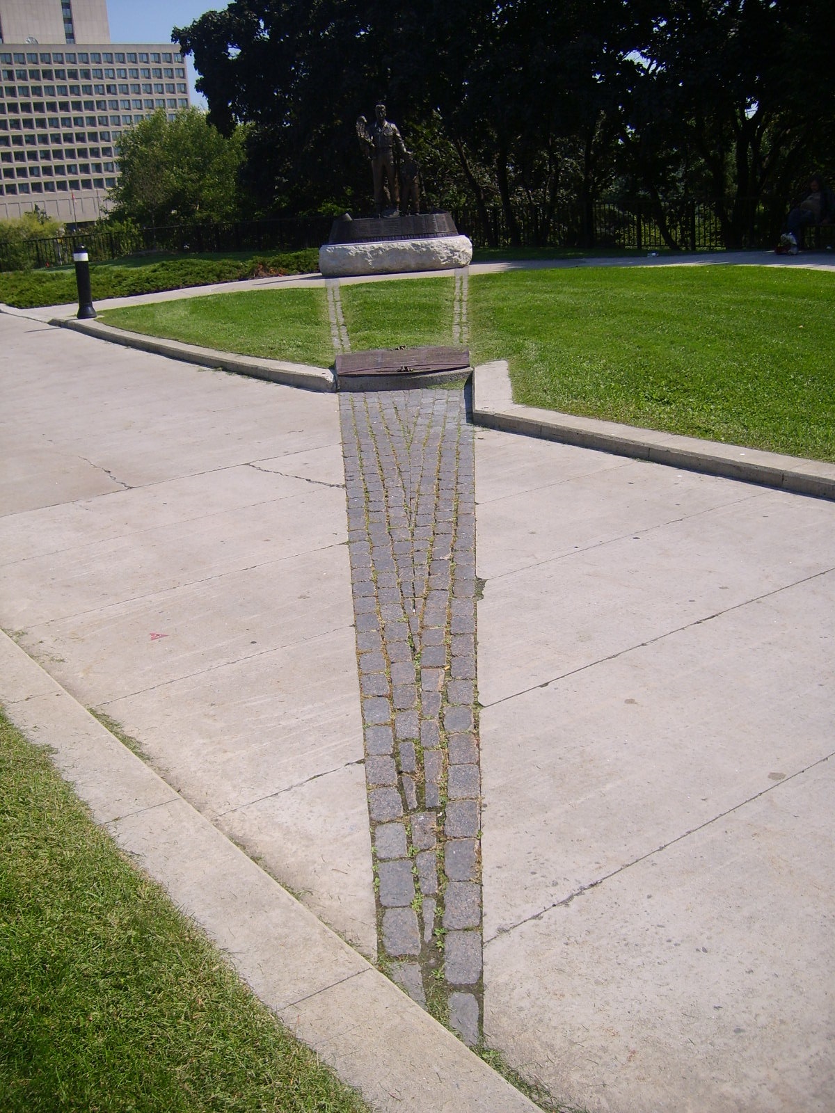 There are three elements to the monument - a statue, a dedication plaque and an arrowhead made of dark granite bricks that extends outward from the statue and plaque. The arrowhead points towards Busan, Korea. The arrowhead was not part of the original design. The monument was carefully placed so that the figures looked along an accurate GPS setting to Busan. The National Capital Commission had a professional geographer make the calculation two times to ensure the exactness. The arrowhead is in line with those calculations.