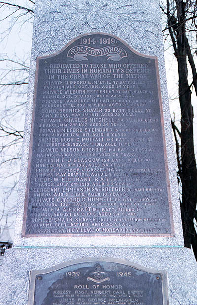 At the end of the First World War, the Glasgow Family, whose son Captain Ernest Glasgow was killed in France during the war, wanted to have a lasting memorial for him and to remember all of the soldiers from the Morewood area who were killed in the Great War. Captain Glasgow was a career military man assigned back to Canada as a training officer. He requested to stay in France but had to accept a demotion to lieutenant to remain. The Glasgow family volunteered to pay for a cenotaph.