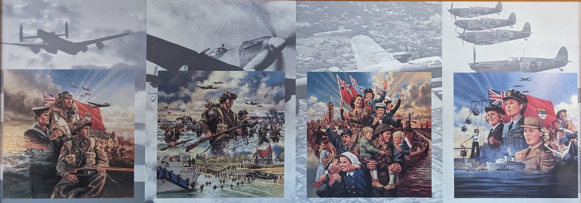With David's permission to use his photos, the project moved forward. Mural of Remembrance took about four months to complete measuring 17 feet long and 6.5 feet high. It includes the four prints of David's photos with black and white backgrounds of Canada's fighter planes. The Western Aviation Museum suggested the backgrounds because the prints could only be enlarged to a certain size. The four prints are: 1 - We Stand on Guard, 2 - Canada at War, 3 - Glorious and Free and 4 - With Glowing Hearts.