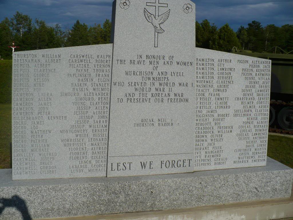 This memorial is dedicated to the brave men and women of Murchison and Lyell Townships who served in the First and Second World Wars and the Korean War. It was unveiled October 8, 2005, by the Murchison and Lyell Cenotaph Committee.