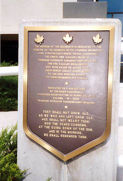 THE MUSEUM OF THE REGIMENTS IS DEDICATED TO THE MEMORY OF THE MEMBERS OF ITS FOUNDING REGIMENTS: LORD STRATHCONA'S HORSE (ROYAL CANADIANS), THE KING'S OWN CALGARY REGIMENT, PRINCESS PATRICIA'S CANADIAN LIGHT INFANTRY, AND THE CALGARY HIGHLANDERS WHO WERE KILLED ON ACTIVE DUTY. THEIR HEROIC LEGACY CONTRIBUTED TO THE RICH HERITAGE EARNED BY THEIR REGIMENTS FOR CANADA.