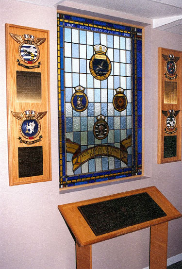 The window is in colour with a dedication, four badges: Shearwater, Warrior, Magnificent, and Bonaventure and a caption.