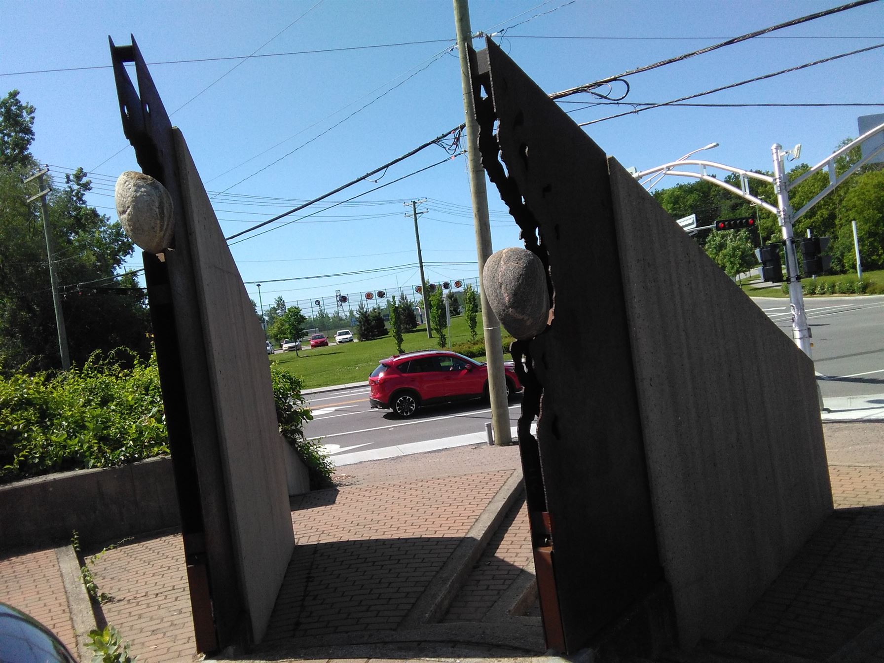The Never Again monument consists of an aluminum globe on a granite base beside an infrared granite slab, surrounded by 5 cement slabs with welded iron sculptures, boulders and three flagpoles - Gatineau, Quebec and Canada.