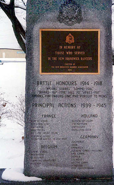 This memorial is dedicated to the New Brunswick Rangers. It was erected in 1980 by the New Brunswick Rangers Association.