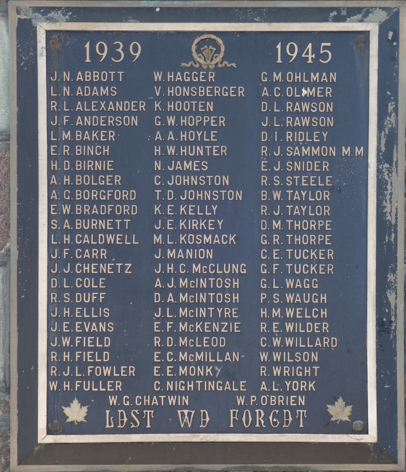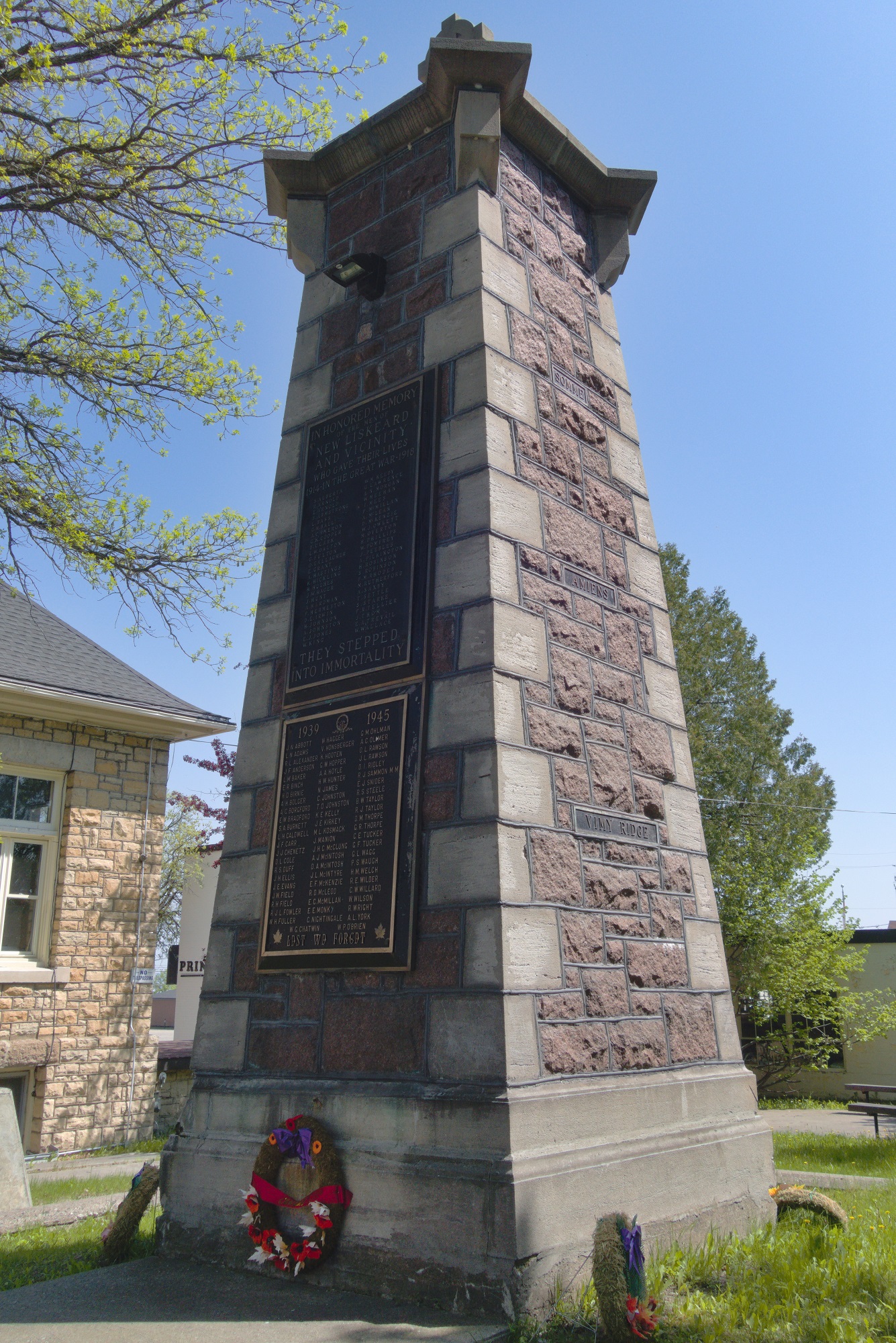 This memorial is dedicated to men killed in action in the First and Second World Wars. It was erected by the Town of New Liskeard.