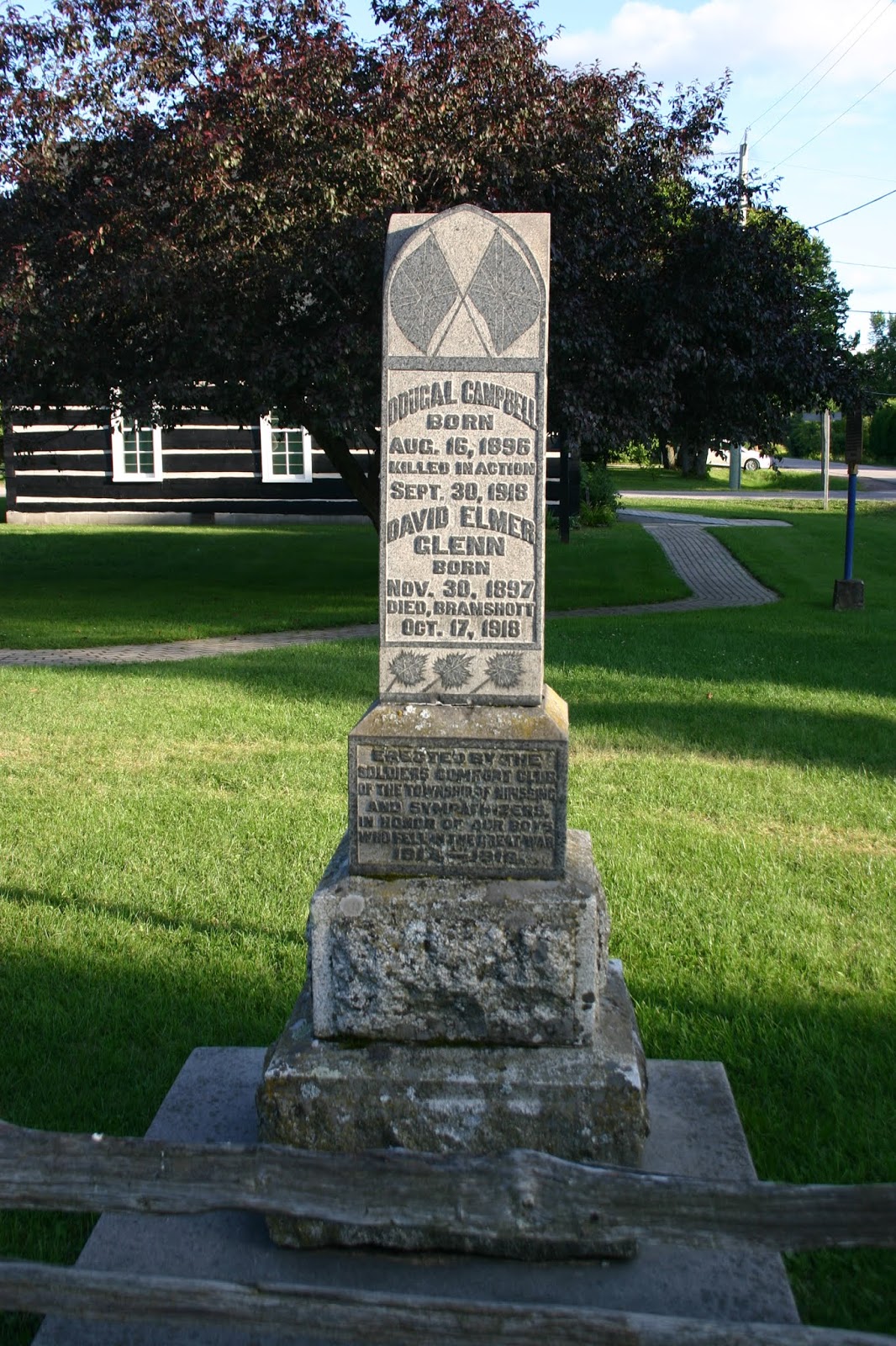 Erected by the Soldiers' Comfort Club of the Township of Nipissing, this memorial is dedicated to the local war dead of the First World War. During the war years, the women of the area had formed what became known as "The Soldiers Comfort Club" and various "comforts" were sent to the boys overseas. When the war ended, they, and the rest of the community were responsible for erecting this monument.