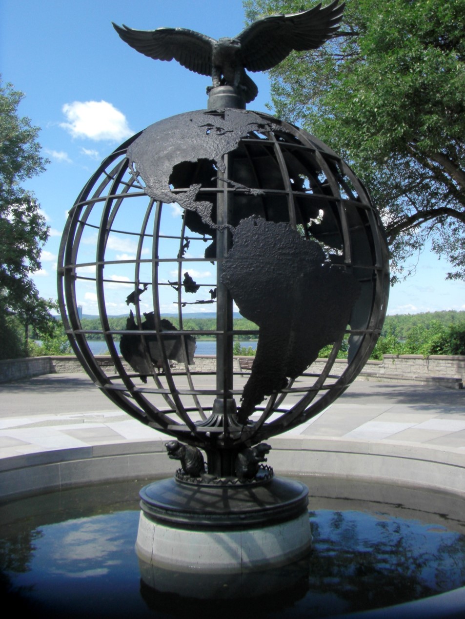 The main feature is a sculptured terrestrial globe in bronze, 3 metres in diameter, on a base formed by three bronze beavers rising from the centre of an ornamental pool. The globe, of open lattice-work corresponding to the lines of latitude and longitude, on which the land masses are super imposed in low relief, is crowned by the Air Forces emblem of a bronze eagle with outspread wings.