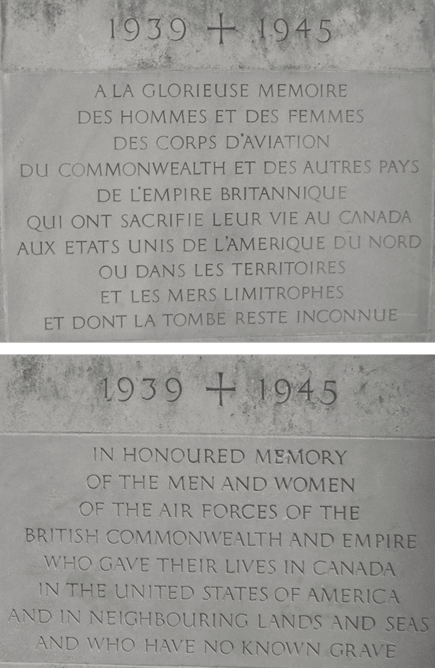 À la glorieuse mémoire des hommes et des femmes de corps d’aviation du Commonwealth et des autres pays de l’Empire britannique qui ont sacrifié leur vie au Canada aux États-Unis de l’Amérique du Nord ou dans les territoires et des mers limitrophes et dont la tombe reste inconnue.
