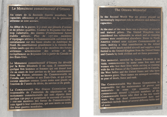 Le Monument commémoratif d’Ottawa fur dévoilé par le Reine Elizabeth II en 1959. Il commémore quelque 800 hommes et femmes qui ont donné leur vie au cours de leur service ou de leur entraînement dans les Forces aériennes du Commonwealth au Canada, aux Antilles et aux États-Unis, et qui n’ont aucune sépulture connue. Leurs noms sont placés en fonction de l’année du décès, du service et du grade.