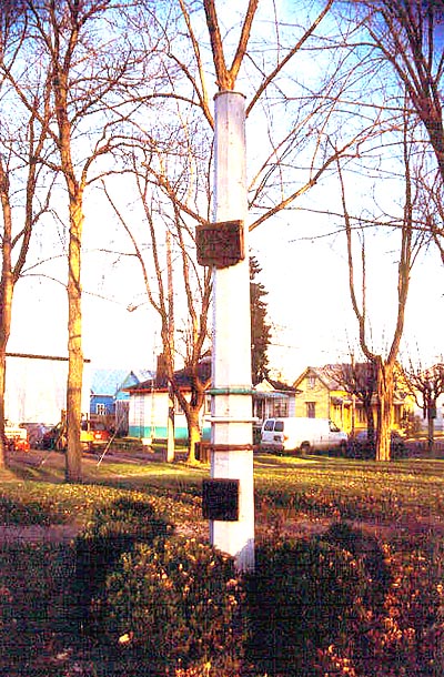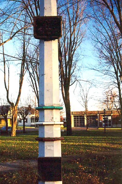 This memorial has three rings in the centre – colours of the Patriots. A wood plaque sculpted with the crisscrossed fork and rifle insignia adorns the top. The memorial was constructed by Alain Charron, from Saint-Denis, and erected on May 24th, 1987 by the 150th Anniversary Commission. The Municipality of Saint-Denis owns the land and the monument.