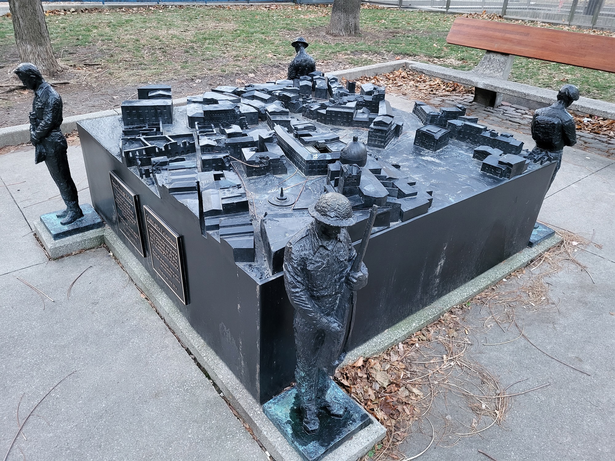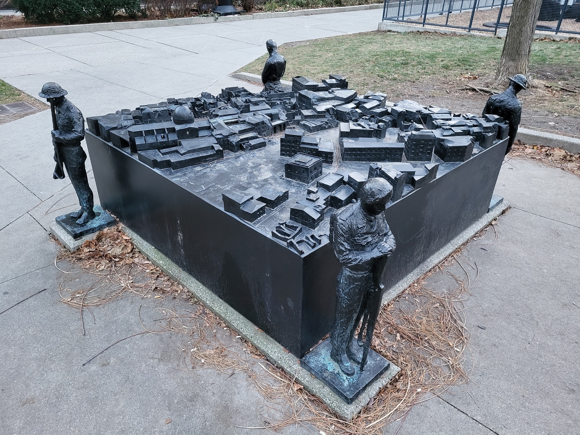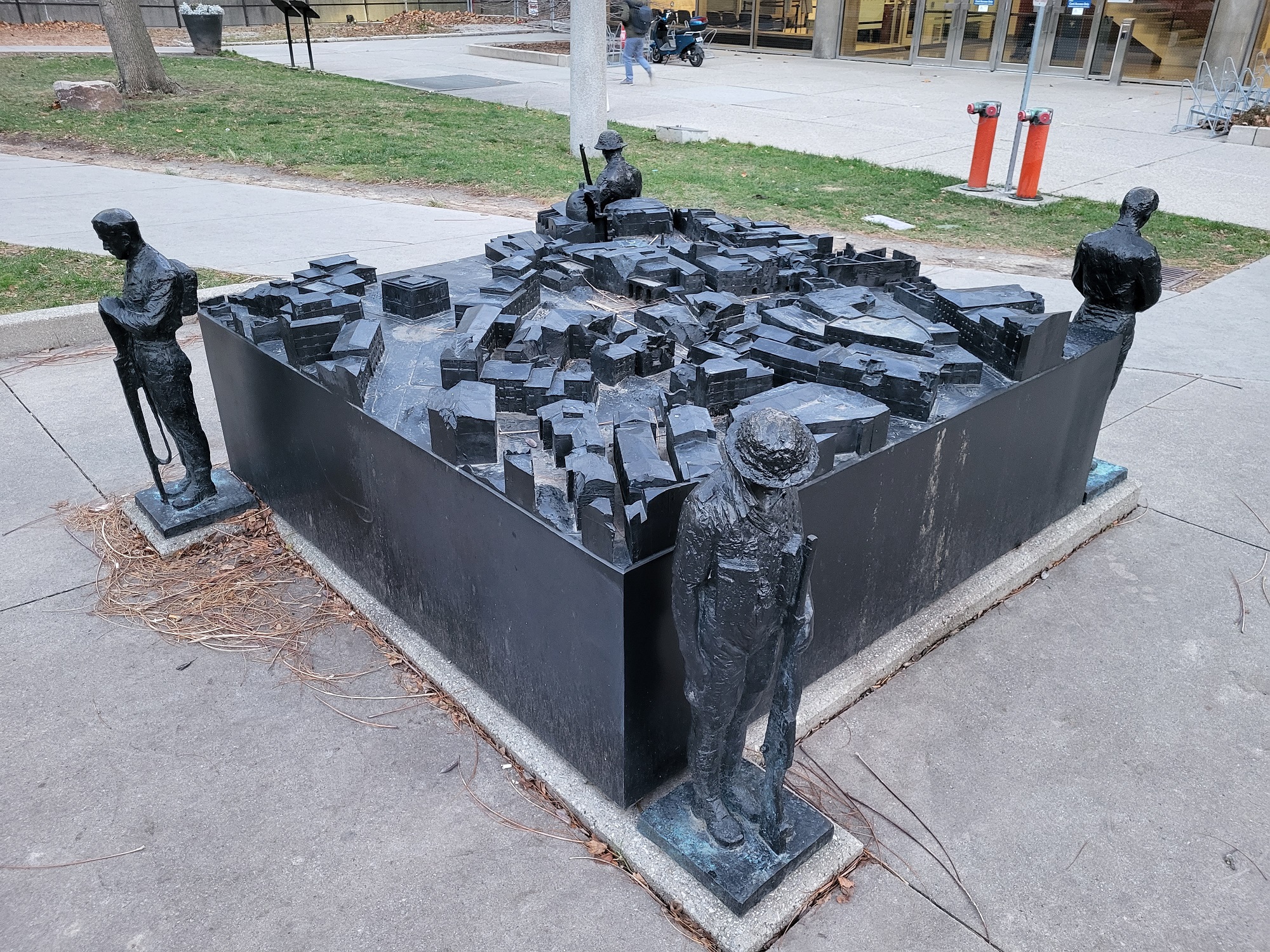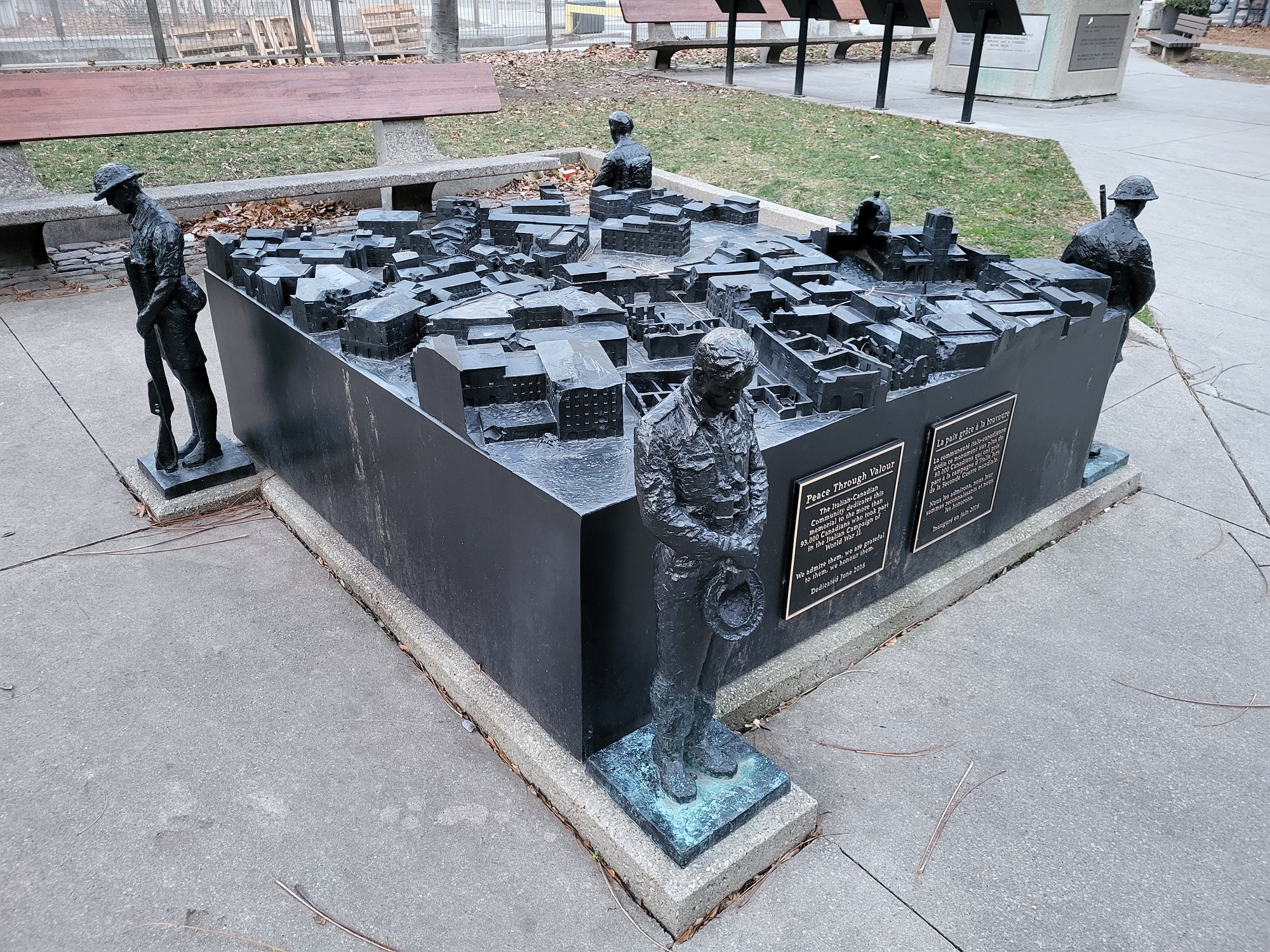 The large bronze sculpture, called Peace Through Valour, presents a 3D printed bronze topographical map of the town of Ortona, where Canadian soldiers fought the fiercest battle in the Italian Campaign, and achieved one of the greatest victories of the Second World War. At each of the four corners of the map, a slightly less than life-size bronze statue of a Canadian soldier stands vigil.