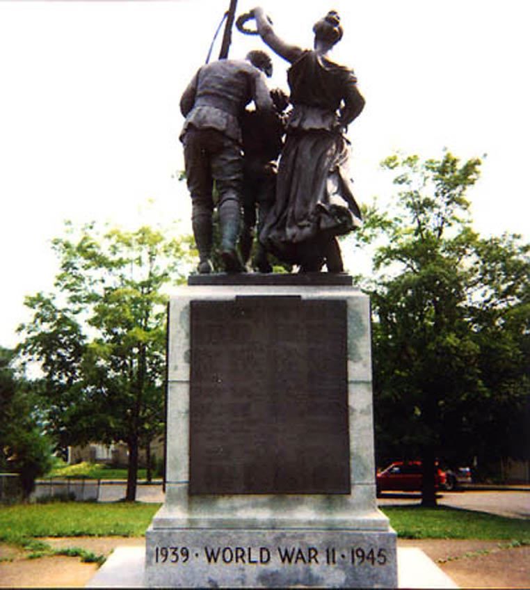 The symbolism of the three bronze figures - one a returned soldier to typify all his class. The female figure is Justice, who has tested his merits in the scales and has found him worthy of the laurel wreath with which she is about to crown him. The youth is a Boy Scout, too young himself for military service, who welcomes his soldier father home.