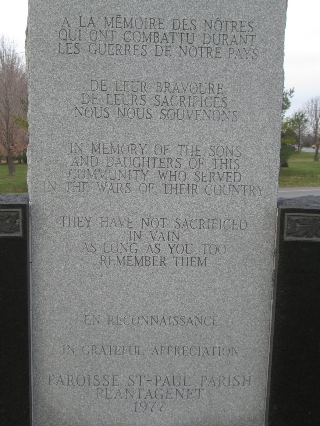 The Plantagenet Cenotaph is dedicated to the men and women of the community who served in the wars of Canada. It was erected by St Paul Parish in 1977.