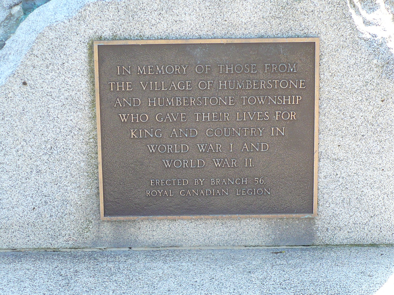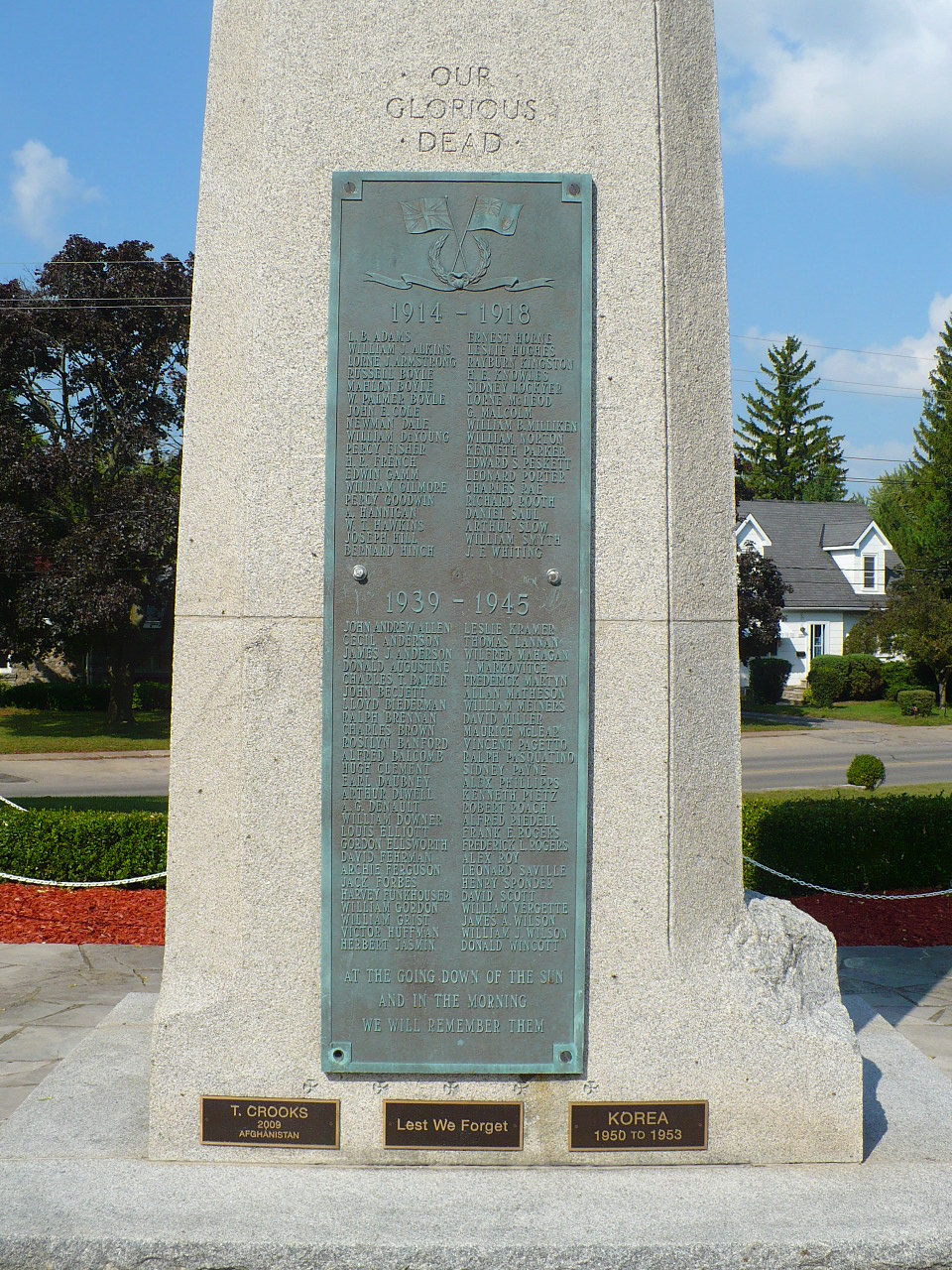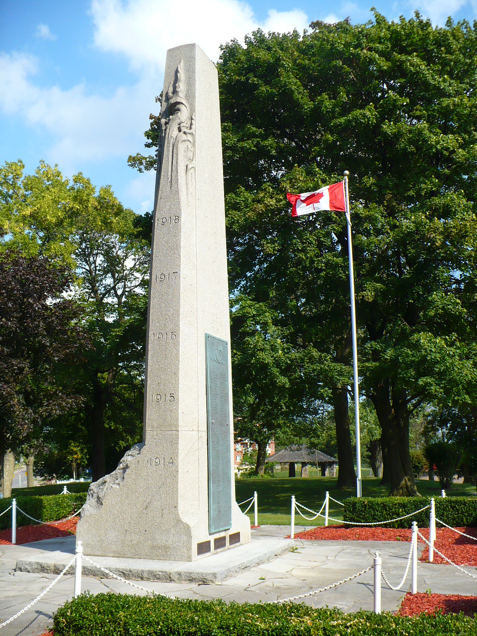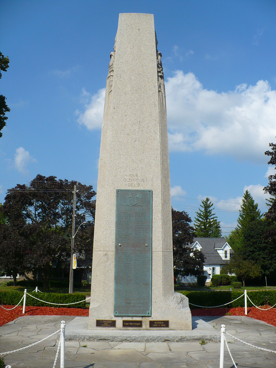 This memorial, which bears a metal sculptured sword driven into the slab base, was erected by the City of Port Colborne in memory of the local war dead and veterans of the First and Second World Wars and the Korean War. In 1952, a parade of Canadian Corps Unit 43 and the Canadian Legion Branch 56, preceded dedication ceremonies at the Cenotaph, where Major G. Smith Macdonald unveiled the new bronze plaque bearing the names of the fallen of both World Wars, replacing the old plaque which bore only the names from the First World War. The plaque is 90" high and 26" wide. The granite monument is 15' high.