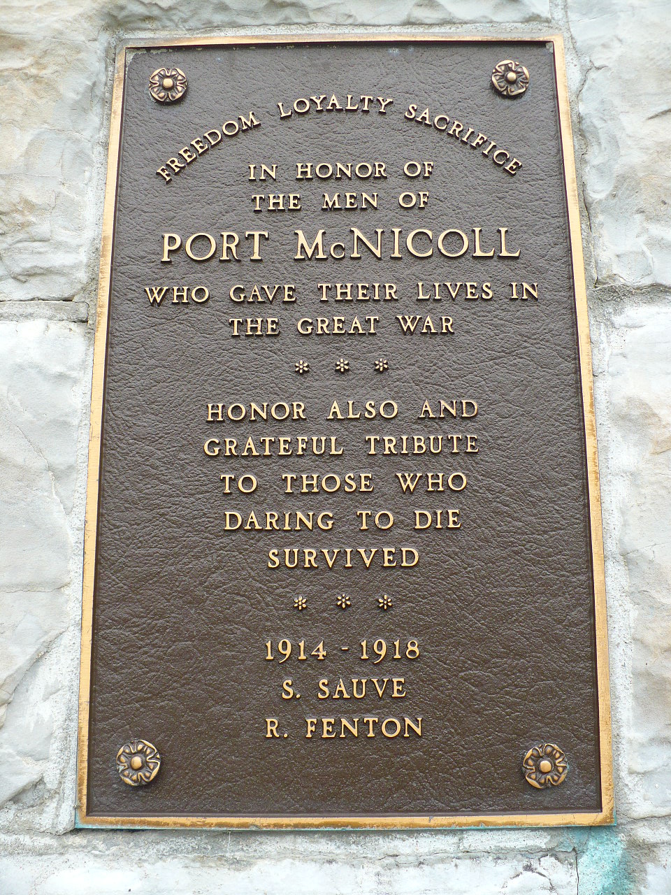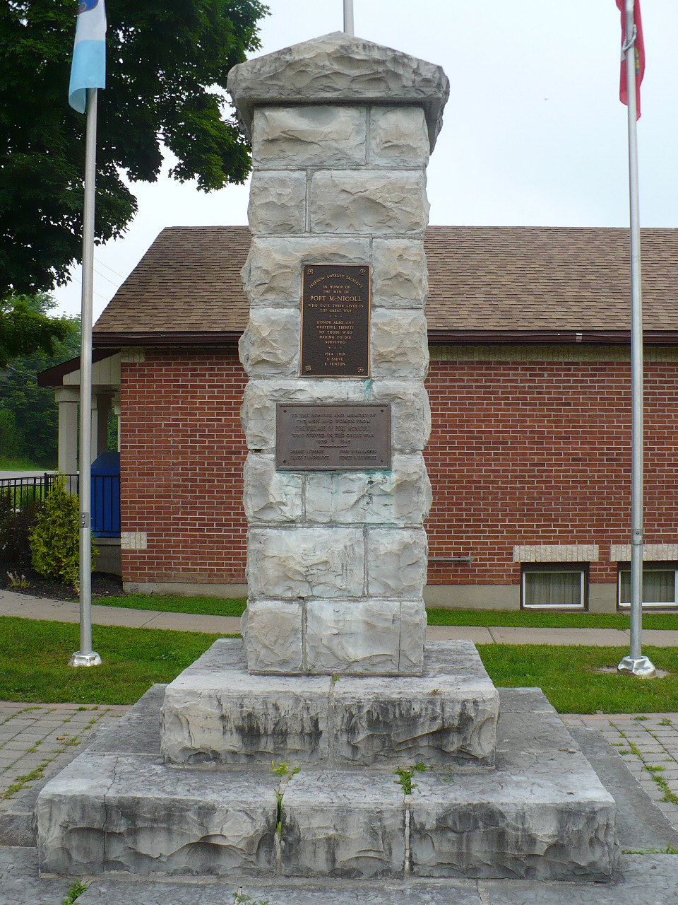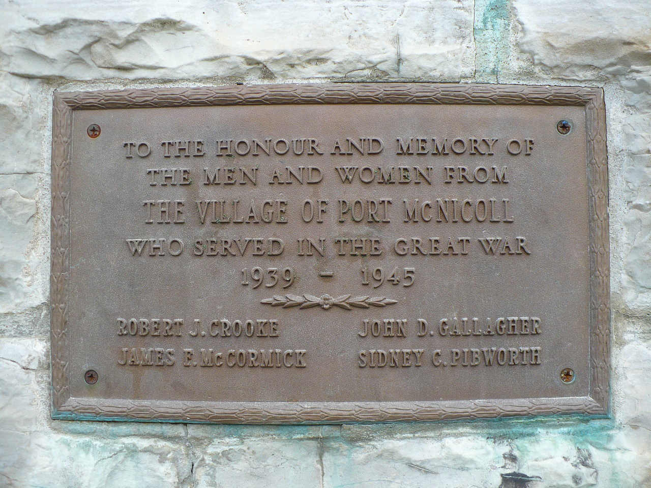 This memorial is a limestone cairn with two small plaques, dedicated to the fallen residents of Port McNicoll who served and died in the First and Second World Wars. It was erected by the Port McNicoll Royal Canadian Legion.