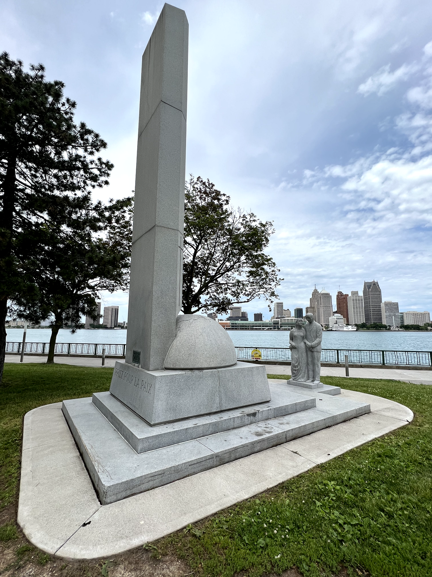 Pray for Peace was unveiled on October 22, 1967, by past State Deputy Louis Salini and dedicated by Most Rev. Wiliam J. Smith Bishop of Pembroke State Chaplain for the Knights of Columbus. The 25 feet high monument weighs 50 tons and was made in 13 sections of Barre granite. It was designed by Donald Ailles of Toronto and produced by the Smith Monument Company of Toronto. Statues of a father, mother and child face the columns and represent a family reading the inscription on the base of the columns.