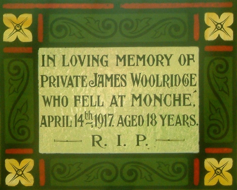 The Private James R. Woolridge Window was erected in 1920. He was a member of the Royal Newfoundland Regiment and was killed in action on April 14, 1917, at Monchy, France.