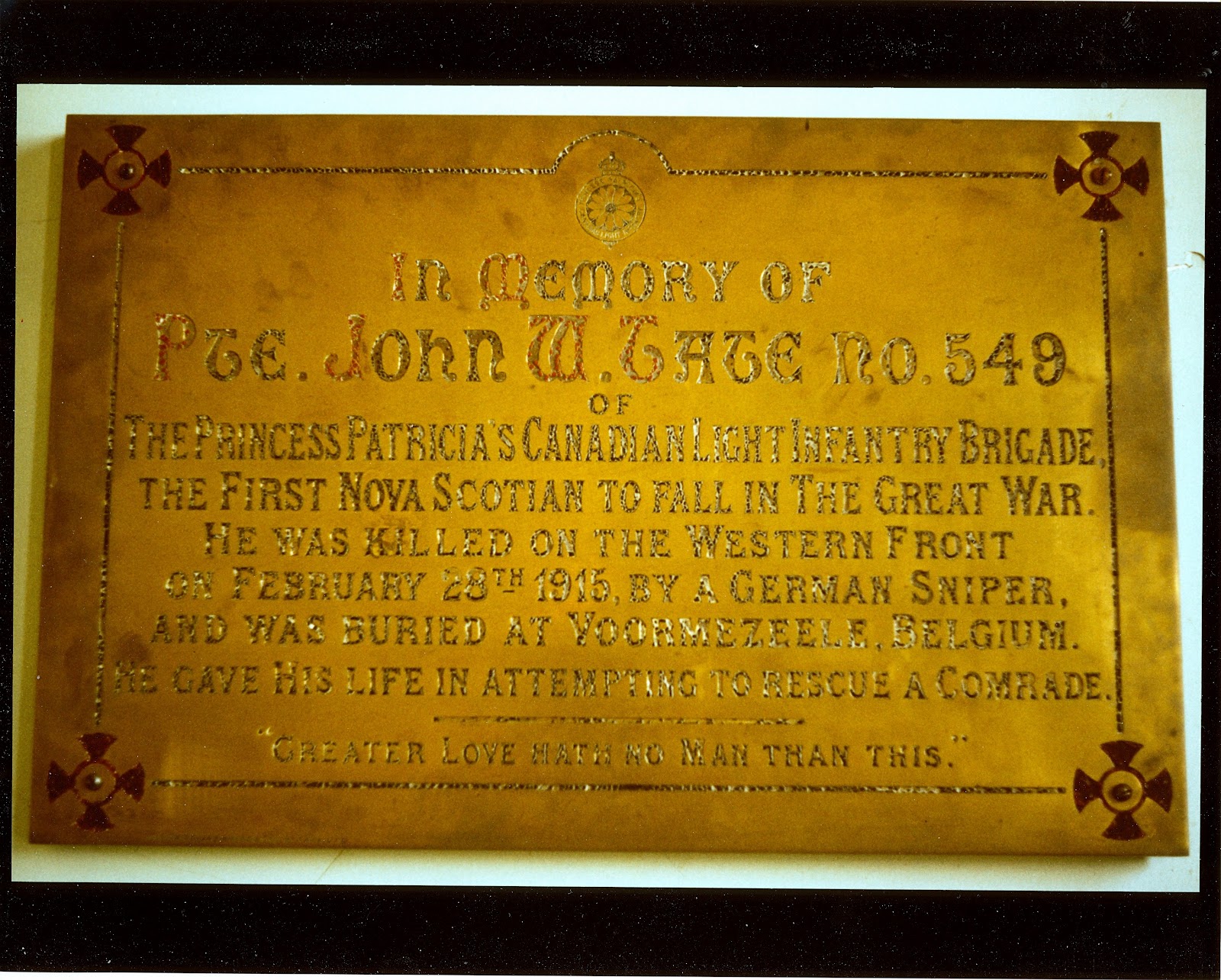 A plaque in honour of Private John W. Tate, the first Nova Scotian to fall in the Great War, is located on the front wall of the Kirk Memorial United Church.