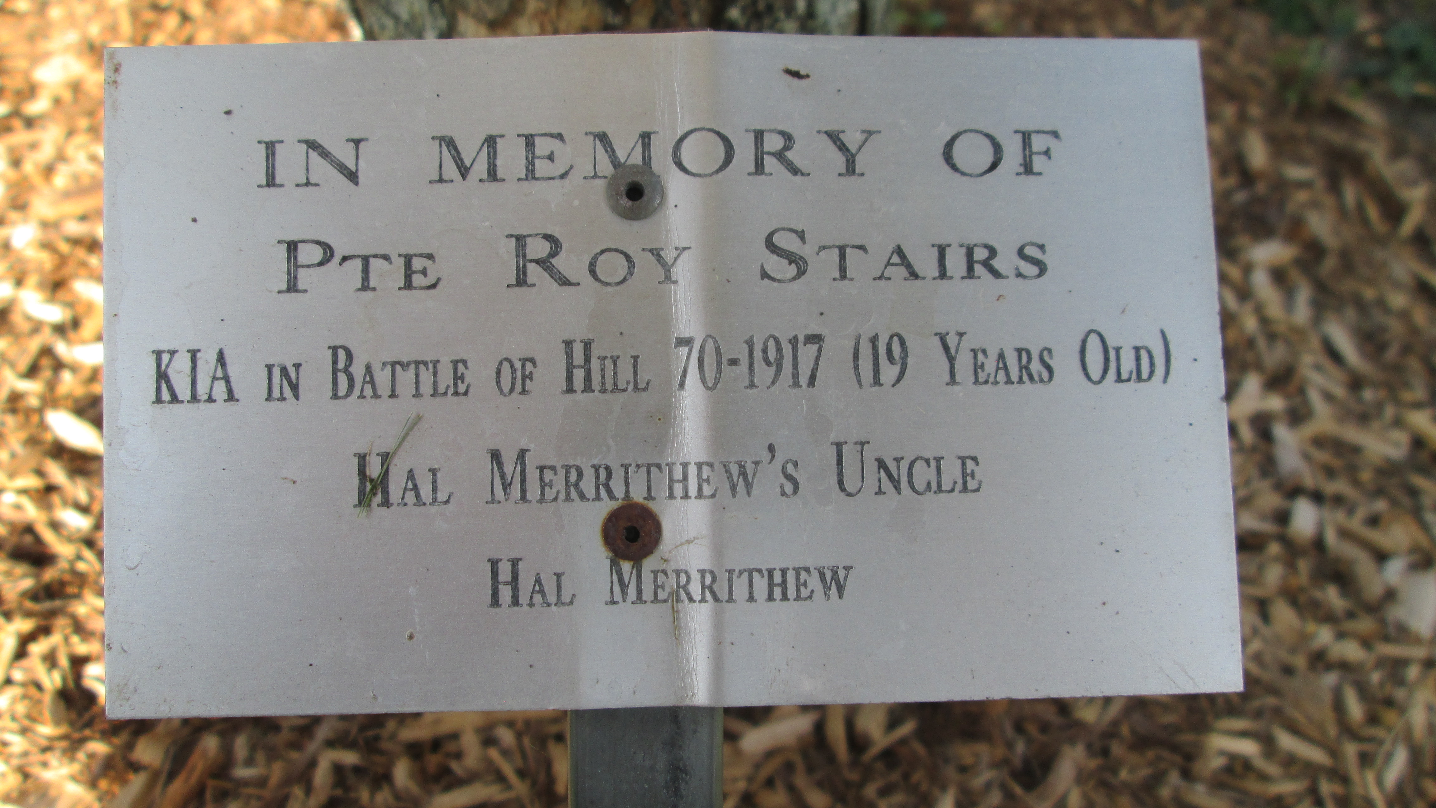 This memorial tree was planted in memory of Private Roy Stairs who was killed during the Battle of Hill 70.